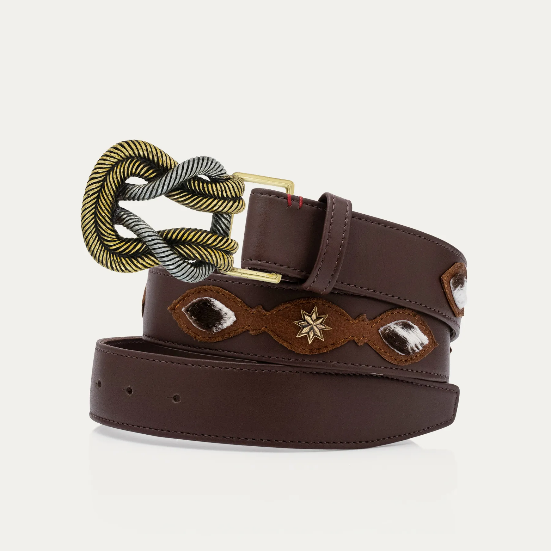 Ce ceinturon, doublé de cuir, est orné d’une magnifique boucle ovale en forme de noeud et en laiton. Elle donne un look fort aux tenues les plus simples et se porte aussi bien sur un jean que sur une robe.