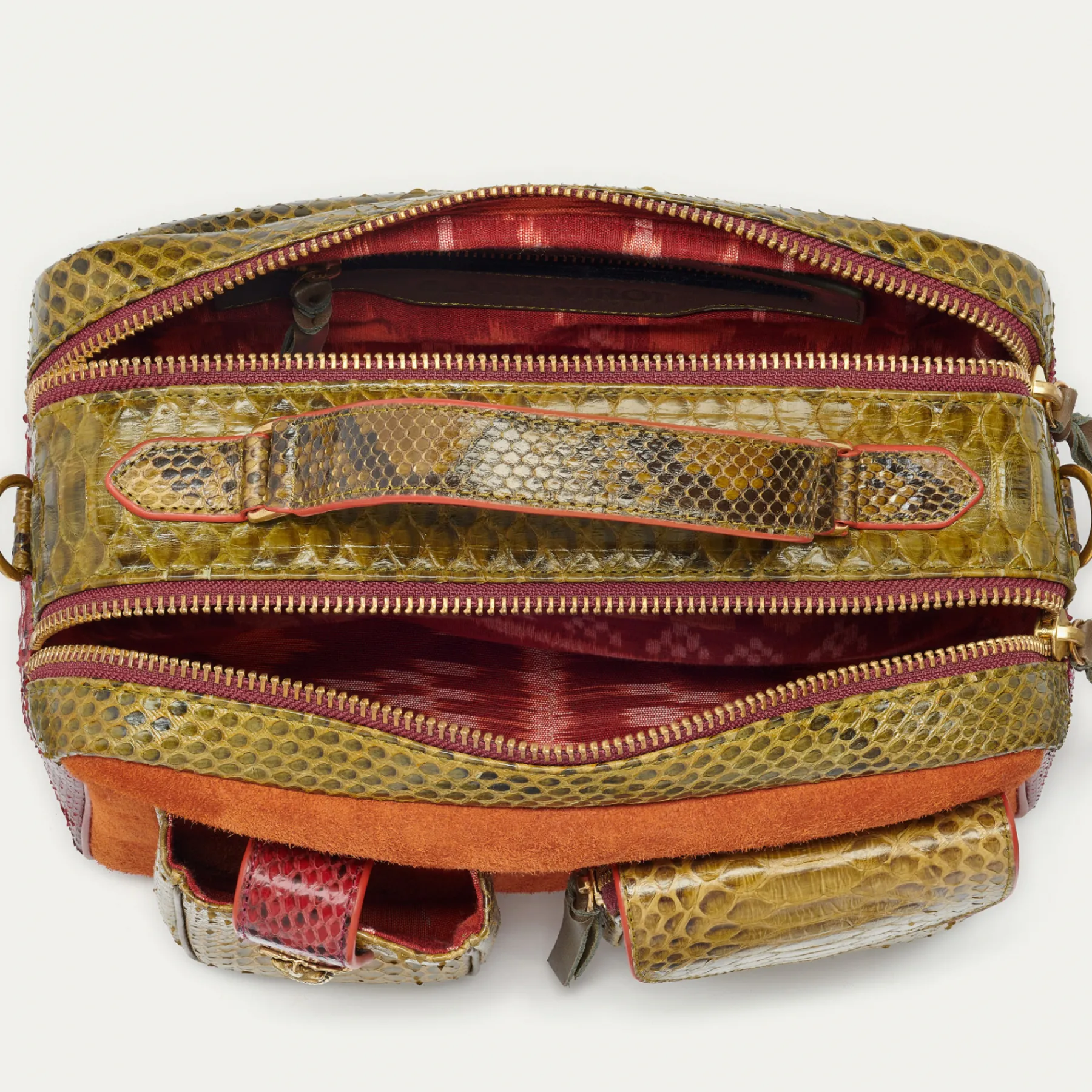 Ce sac en python et cuir suédé porté croisé est organisé en deux compartiments avec deux poches à l’avant et une poche interne. L’une des deux poche est dotée d’un rabat aimanté, et l’autre se referme à l’aide d’un zip. Vous trouverez également une fente secrète sur le dessus prévue pour vos lunettes. Notre César a été spécialement conçu pour une organisation optimale de vos affaires !