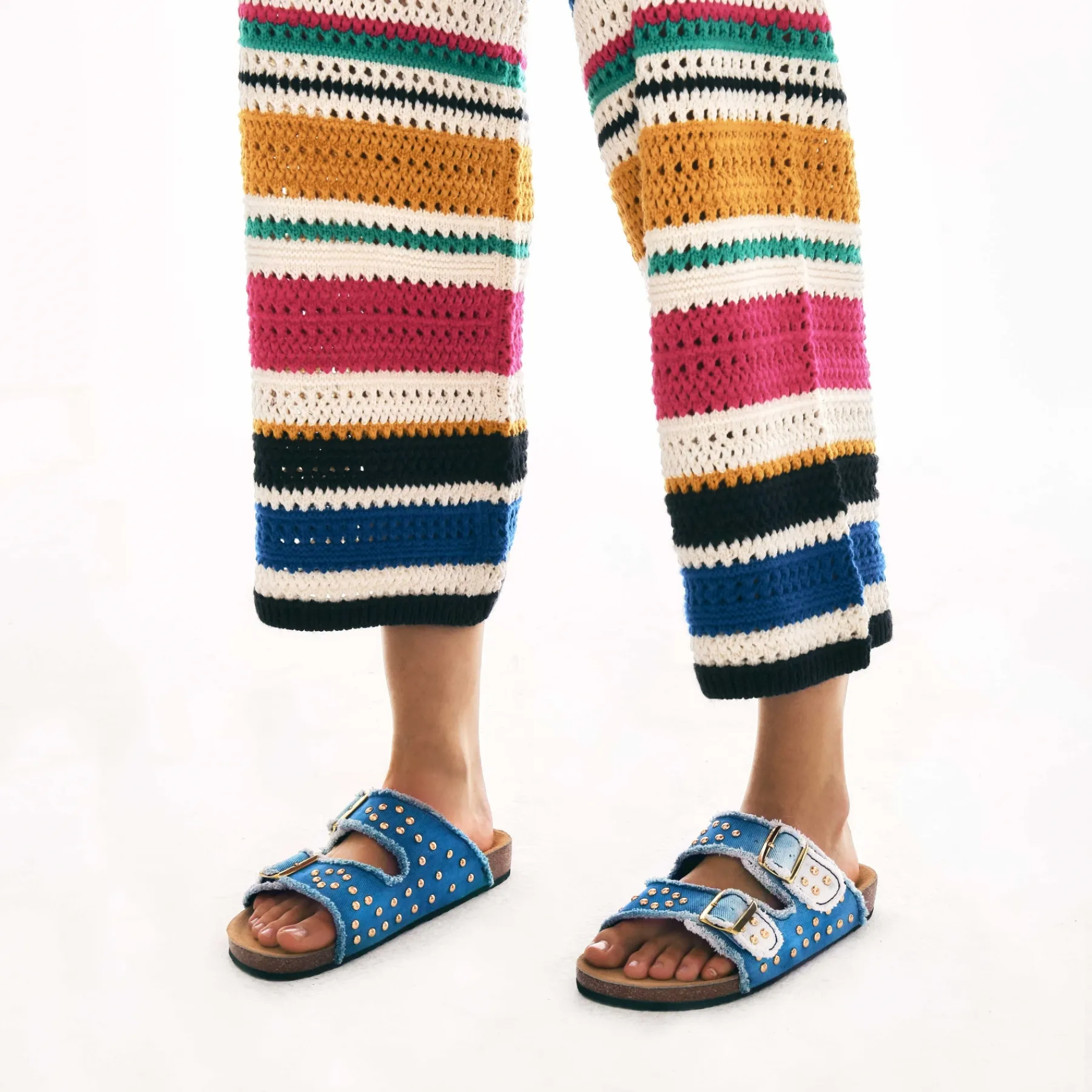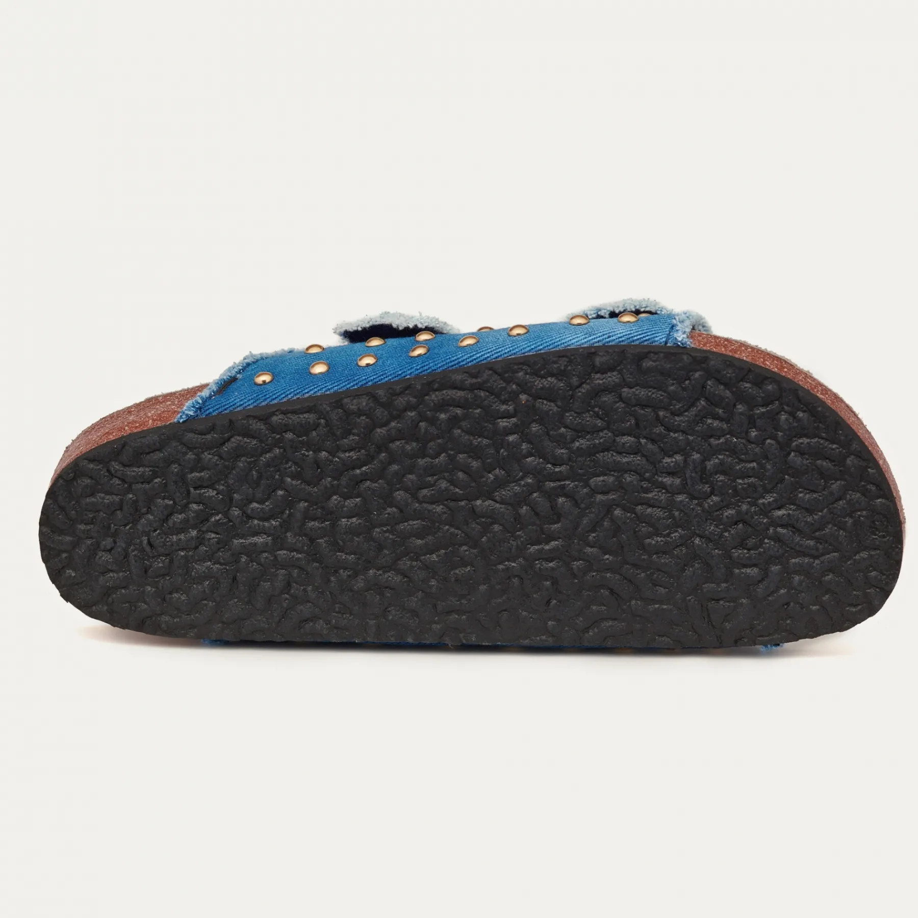 Nos sandales ajustables en Denim Indigo sont doublées cuir et ornées de deux boucles carrées en métal dorée. C…