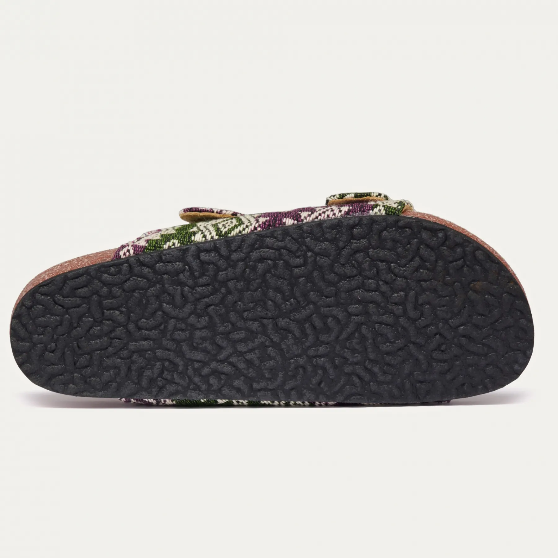 Nos sandales ajustables en tissu sumba bicolore sont doublées cuir et ornées de deux boucles carrées en métal d…
