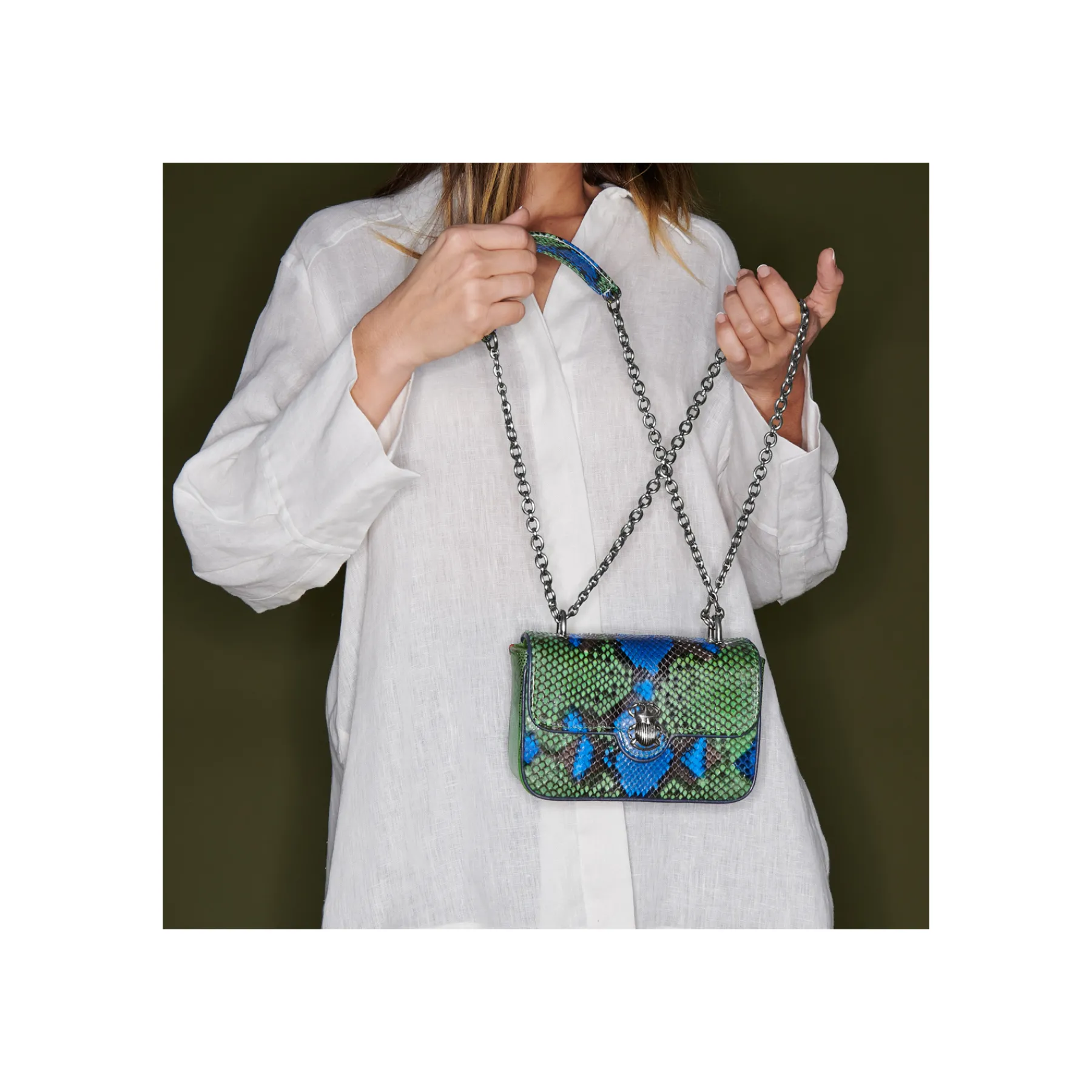Notre mini sac Ava est idéal pour accompagner vos sorties. Ce sac en python et lézard porté épaule ou croisé est doté d’un fermoir bijou ainsi que d’une chaîne artisanale qui peut se porter simple ou double. Ava est organisé en un seul compartiment et s’adaptera en fonction de vos envies et saura discrètement habiller votre tenue pour toutes les occasions.