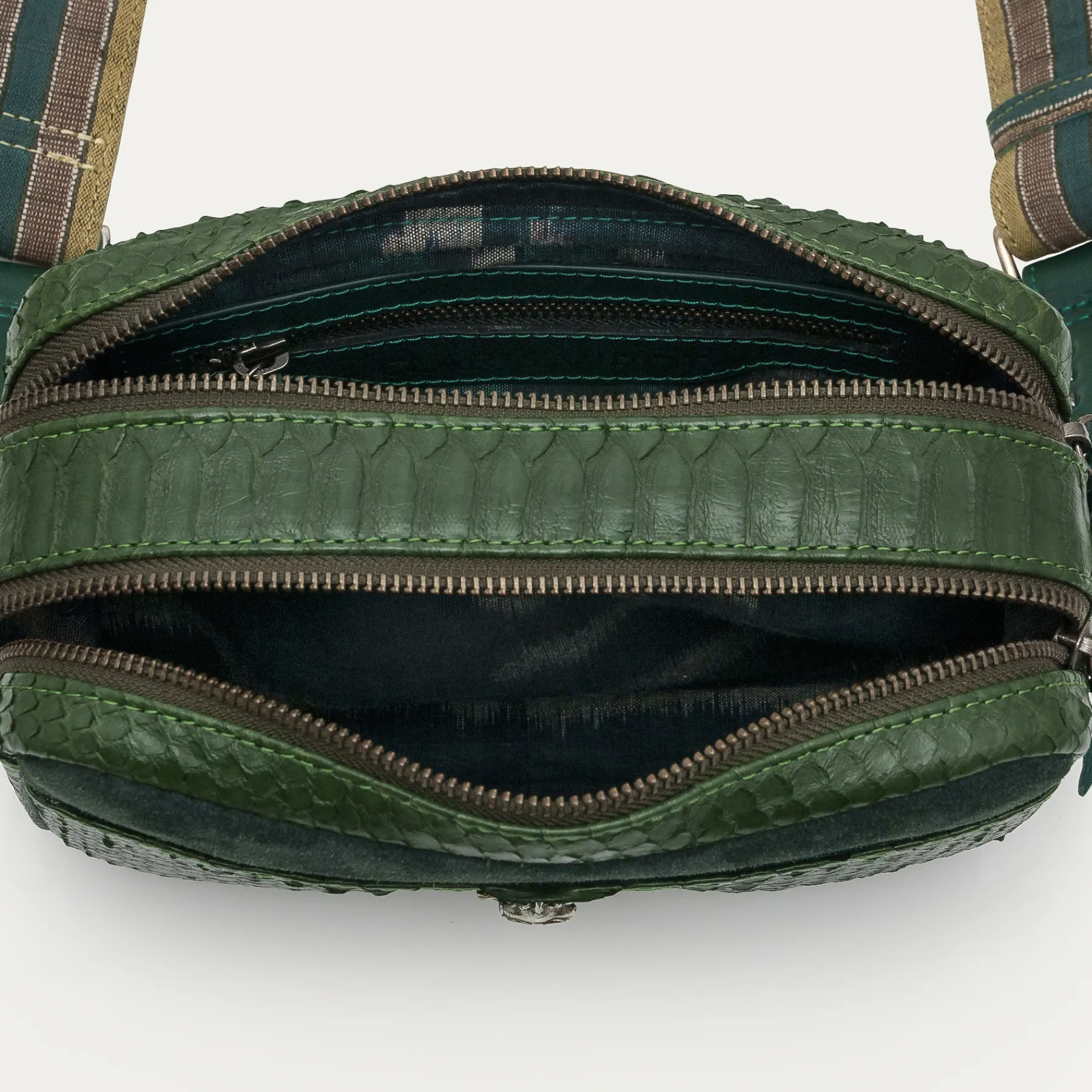 Ce sac en python et agneau velours porté épaule ou croisé est organisé en deux compartiments avec une poche centrale parfaitement étudiée pour y accueillir votre téléphone. Ses deux compartiments distincts ont été pensés afin de vous organiser au mieux! Enfin, sa large bandoulière en tissu Timor permet un porté confortable et léger.