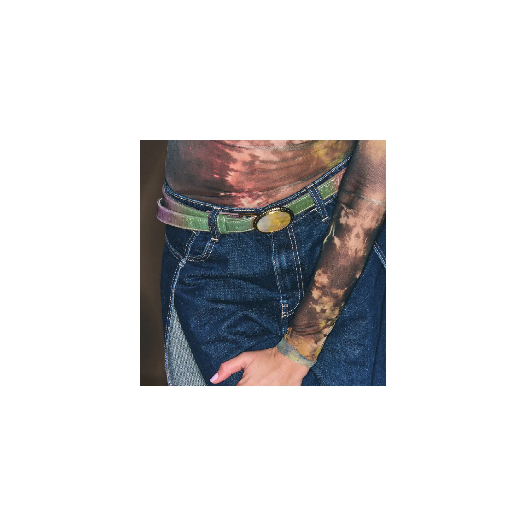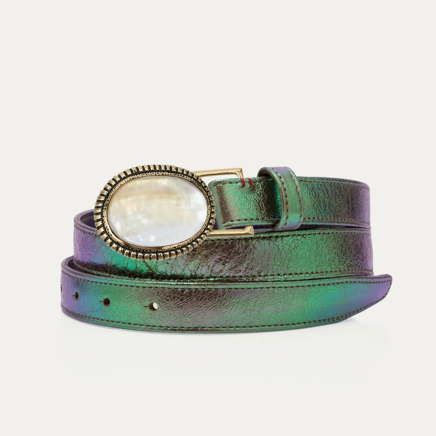 Ce ceinturon, doublé de cuir, est orné d’une magnifique boucle ovale en laiton dans laquelle est incrustée un morceau de peau assorti avec la couleur de la ceinture. Elle donne un look fort aux tenues les plus simples et se porte aussi bien sur un jean que sur une robe.