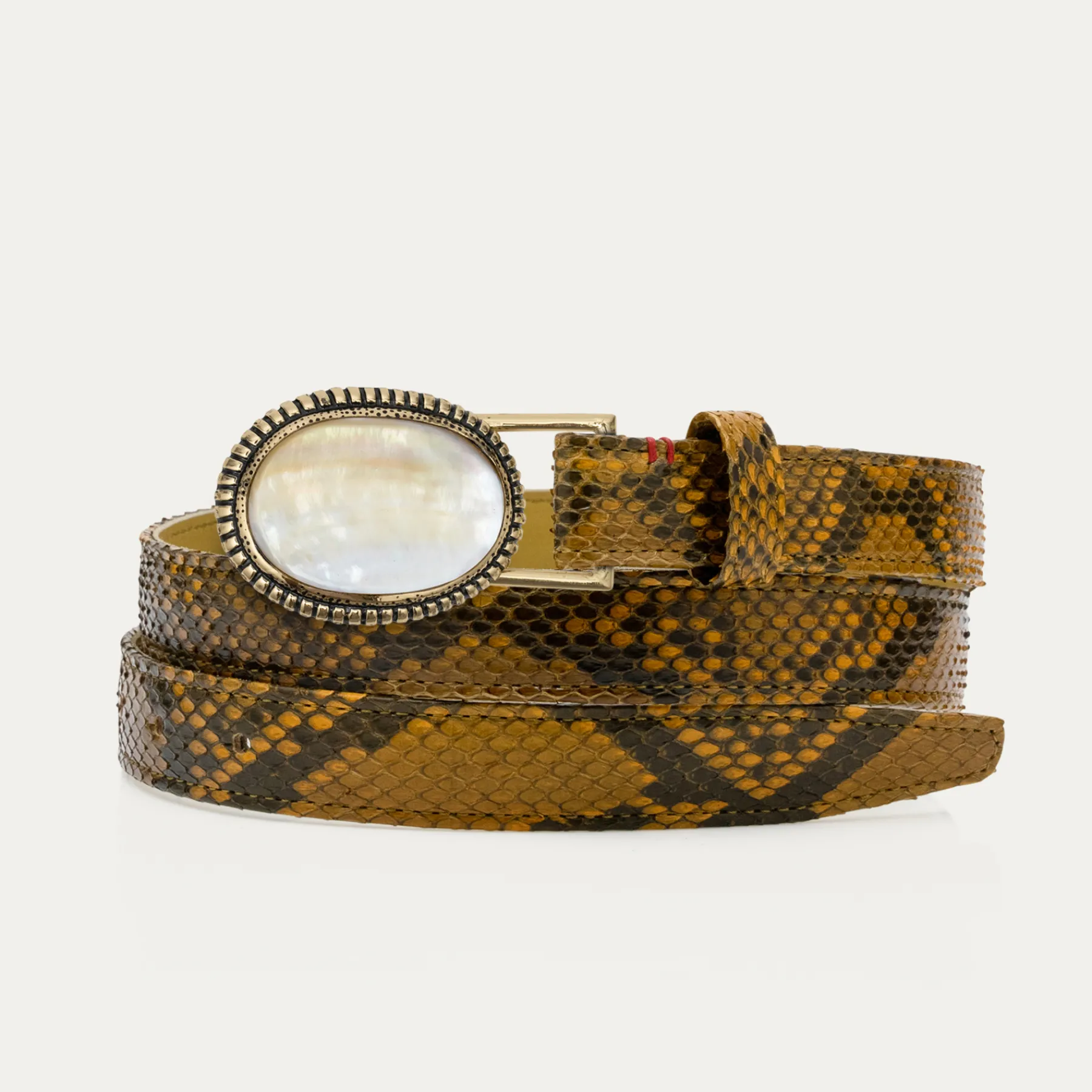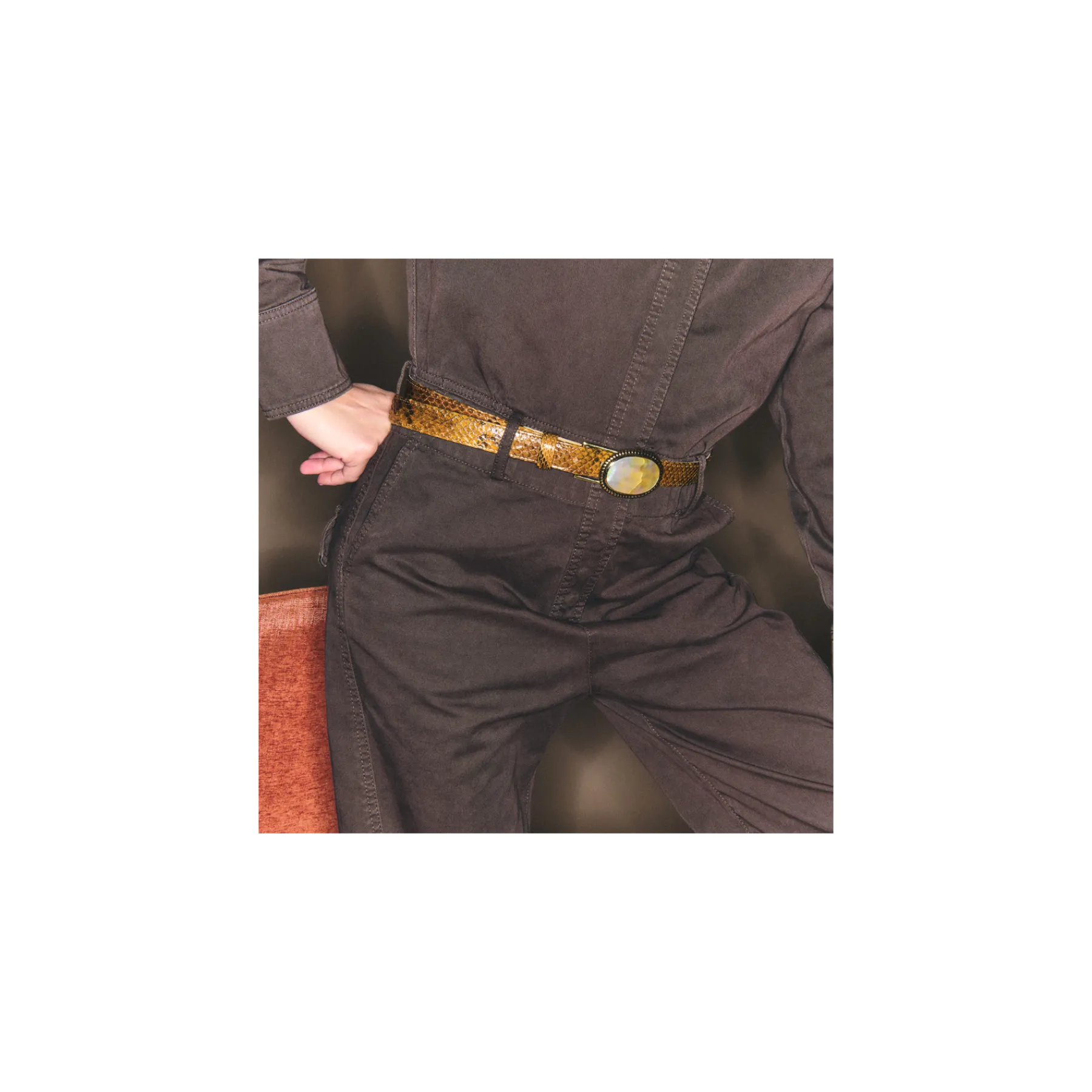 Ce ceinturon en python, doublé de cuir, est orné d’une magnifique boucle ovale en laiton dans laquelle est incrustée un morceau de peau assorti avec la couleur de la ceinture. Elle donne un look fort aux tenues les plus simples et se porte aussi bien sur un jean que sur une robe.