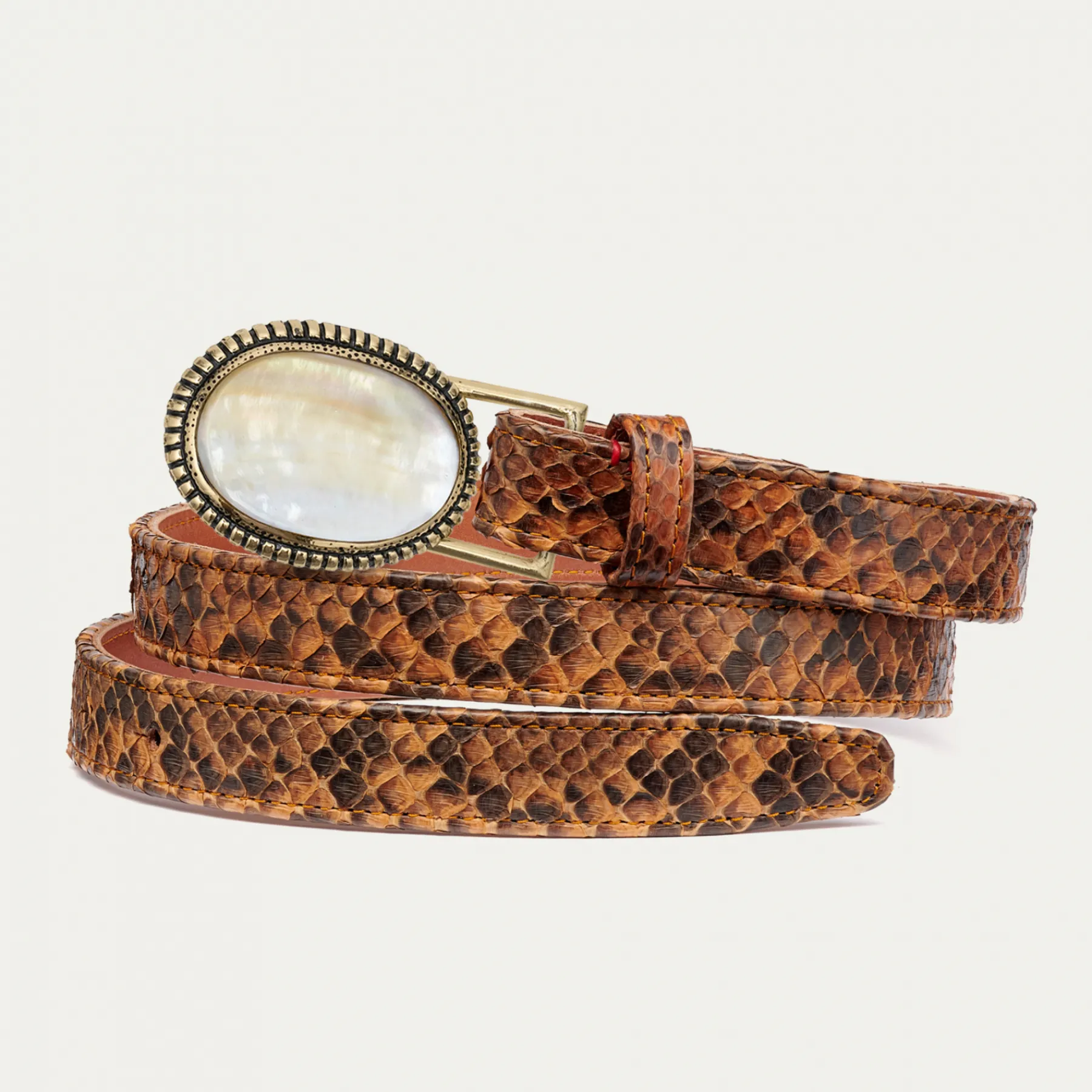 Ce ceinturon en python, doublé de cuir, est orné d’une magnifique boucle ovale en laiton dans laquelle est incrustée un morceau de peau assorti avec la couleur de la ceinture. Elle donne un look fort aux tenues les plus simples et se porte aussi bien sur un jean que sur une robe.
