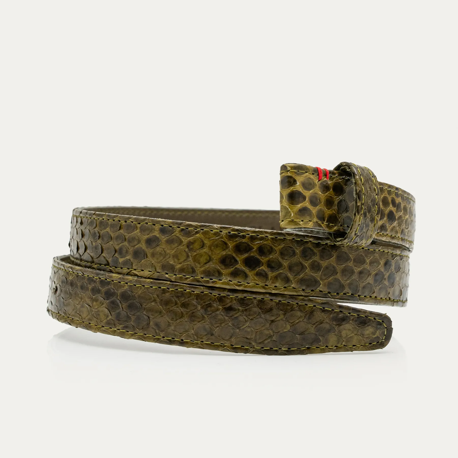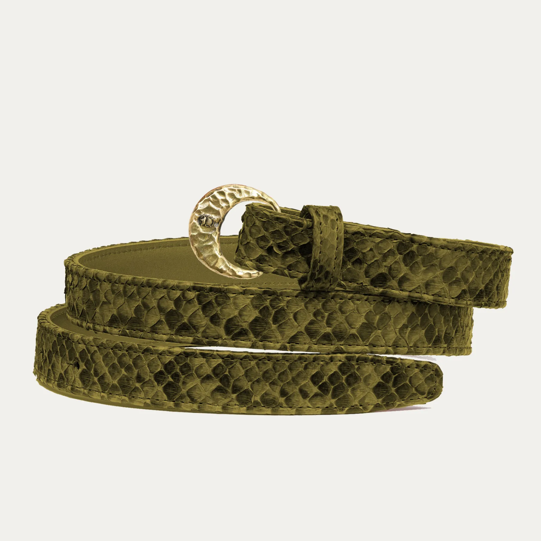 Ce ceinturon plus fin, doublé de cuir, est orné d’une magnifique boucle en laiton en forme de demi-lune. Elle donne un look fort aux tenues les plus simples et se porte aussi bien sur un jean que sur une robe.