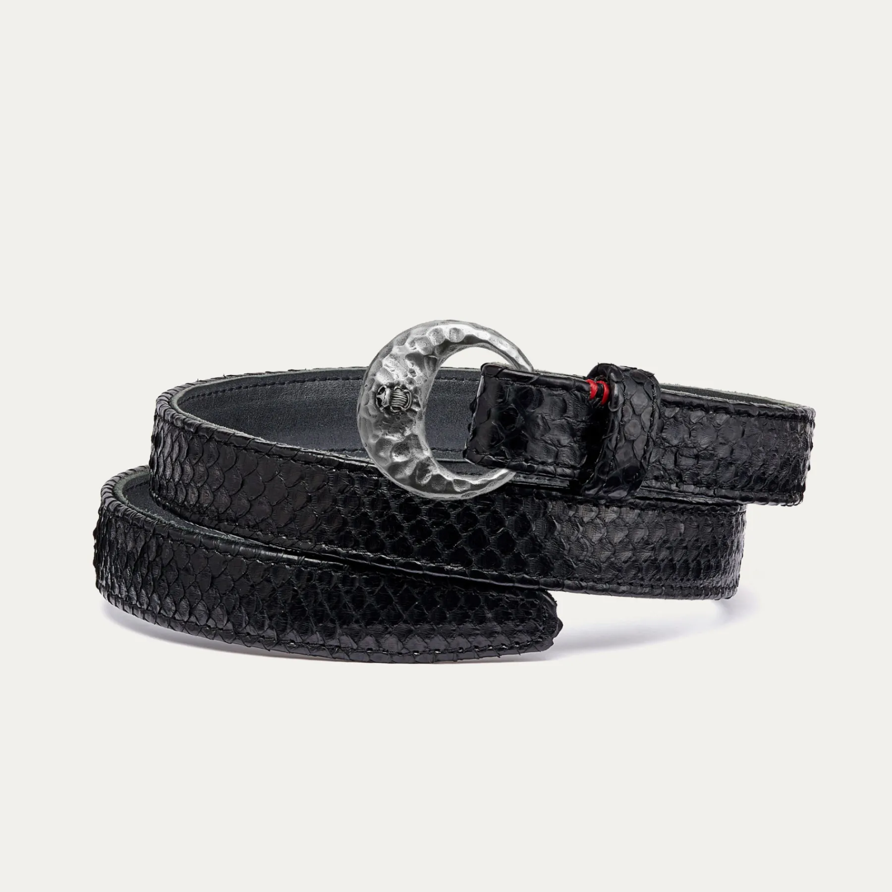 Ce ceinturon plus fin, doublé de cuir, est orné d’une magnifique boucle en laiton en forme de demi-lune. Elle donne un look fort aux tenues les plus simples et se porte aussi bien sur un jean que sur une robe.