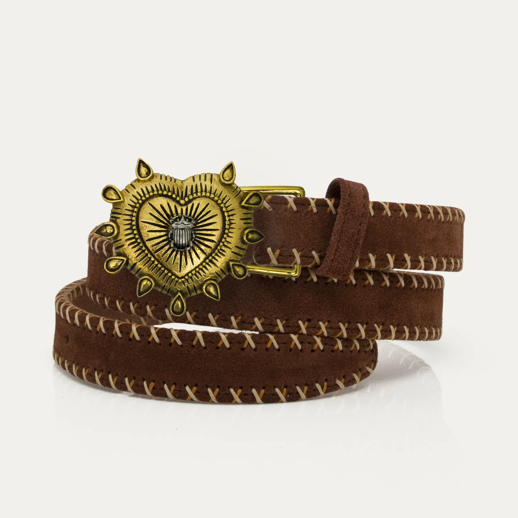 Ce ceinturon plus fin, doublé de cuir, est orné d’une magnifique boucle en laiton avec un ex-voto au milieu. Il ajoute une touche distinctive aux tenues les plus simples et se porte aussi bien sur un jean que sur une robe.
