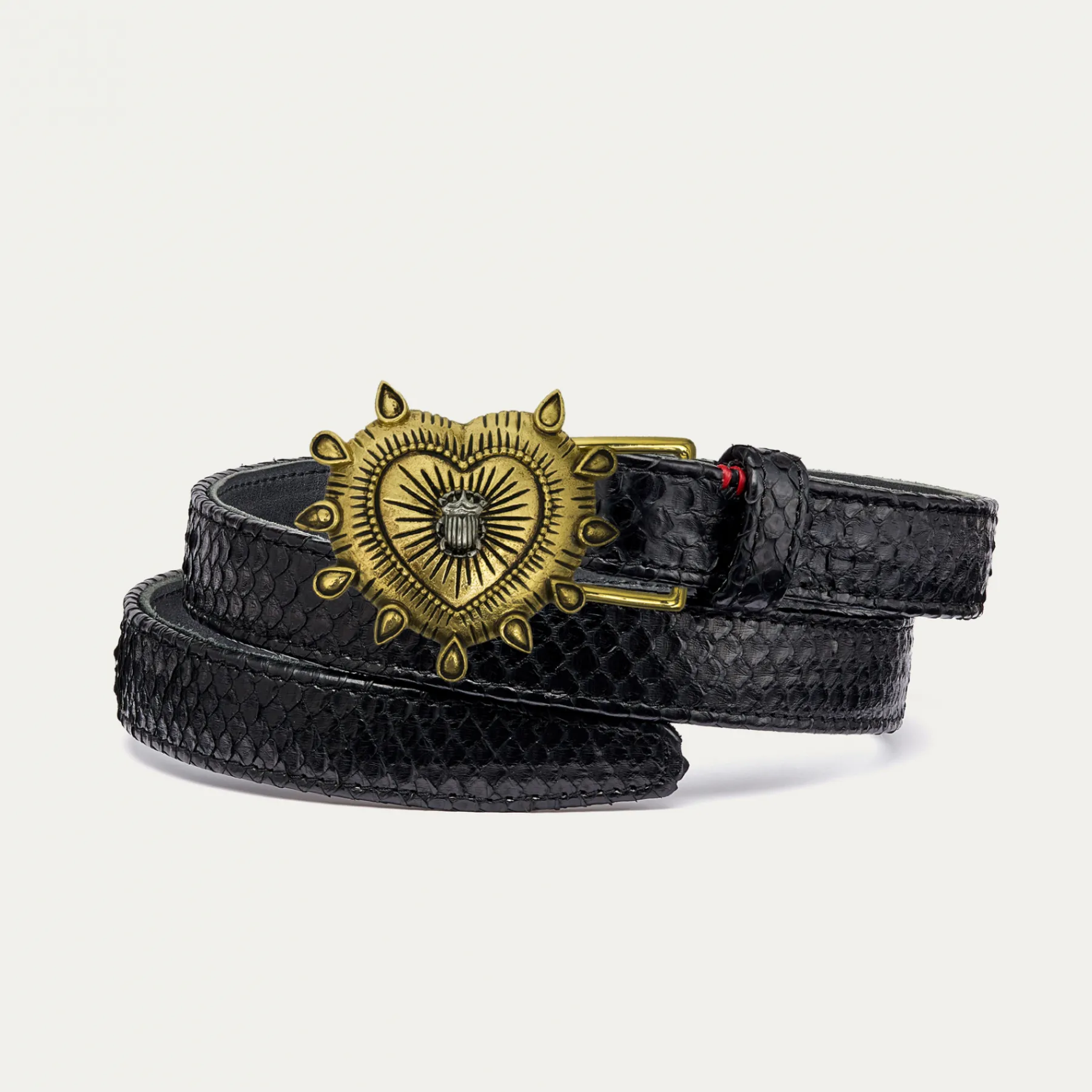 Ce ceinturon en python, doublé de cuir, est orné d’une magnifique boucle ex-voto. Elle donne un look fort aux tenues les plus simples et se porte aussi bien sur un jean que sur une robe.