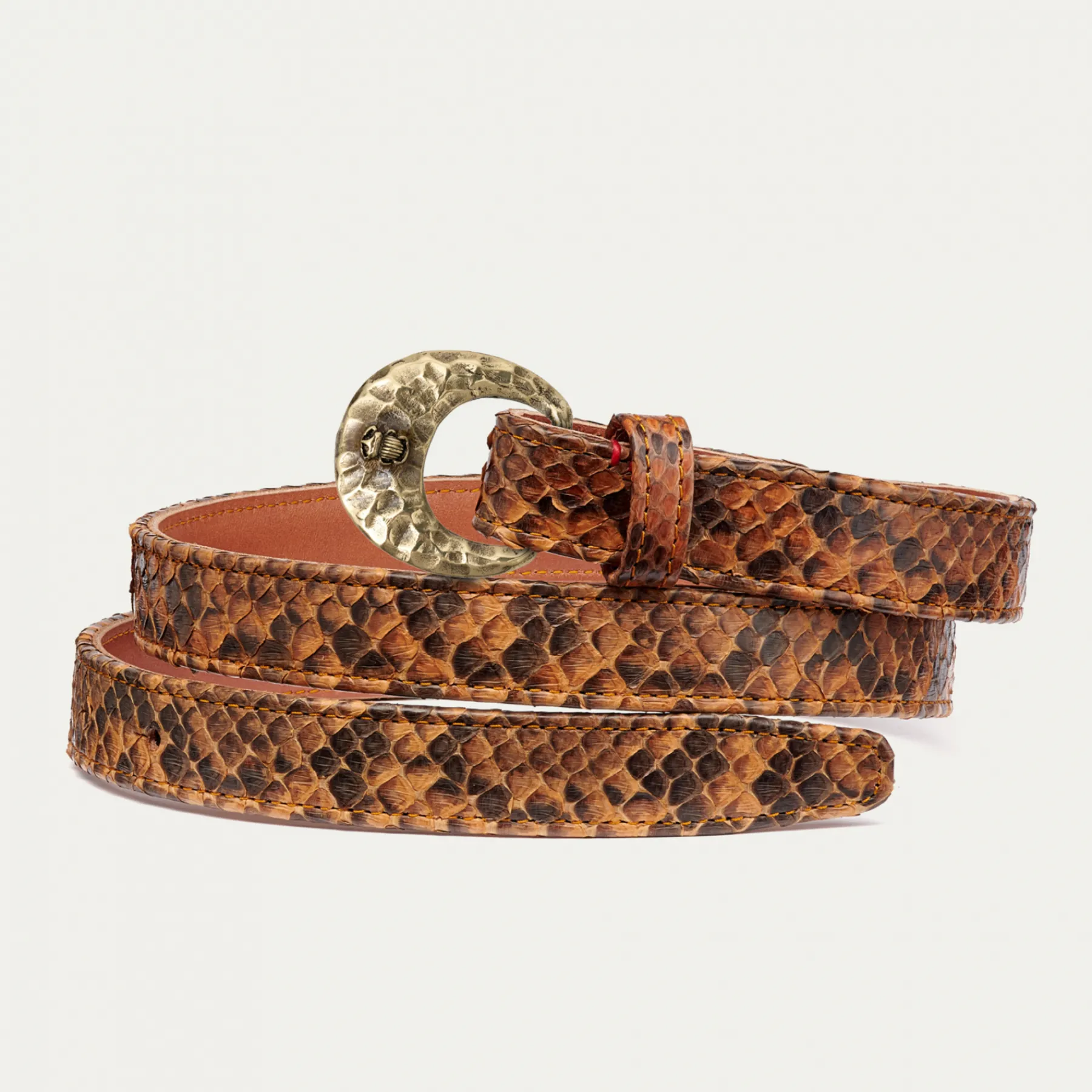 Ce ceinturon en python, doublé de cuir, est orné d’une magnifique boucle ex-voto. Elle donne un look fort aux tenues les plus simples et se porte aussi bien sur un jean que sur une robe.