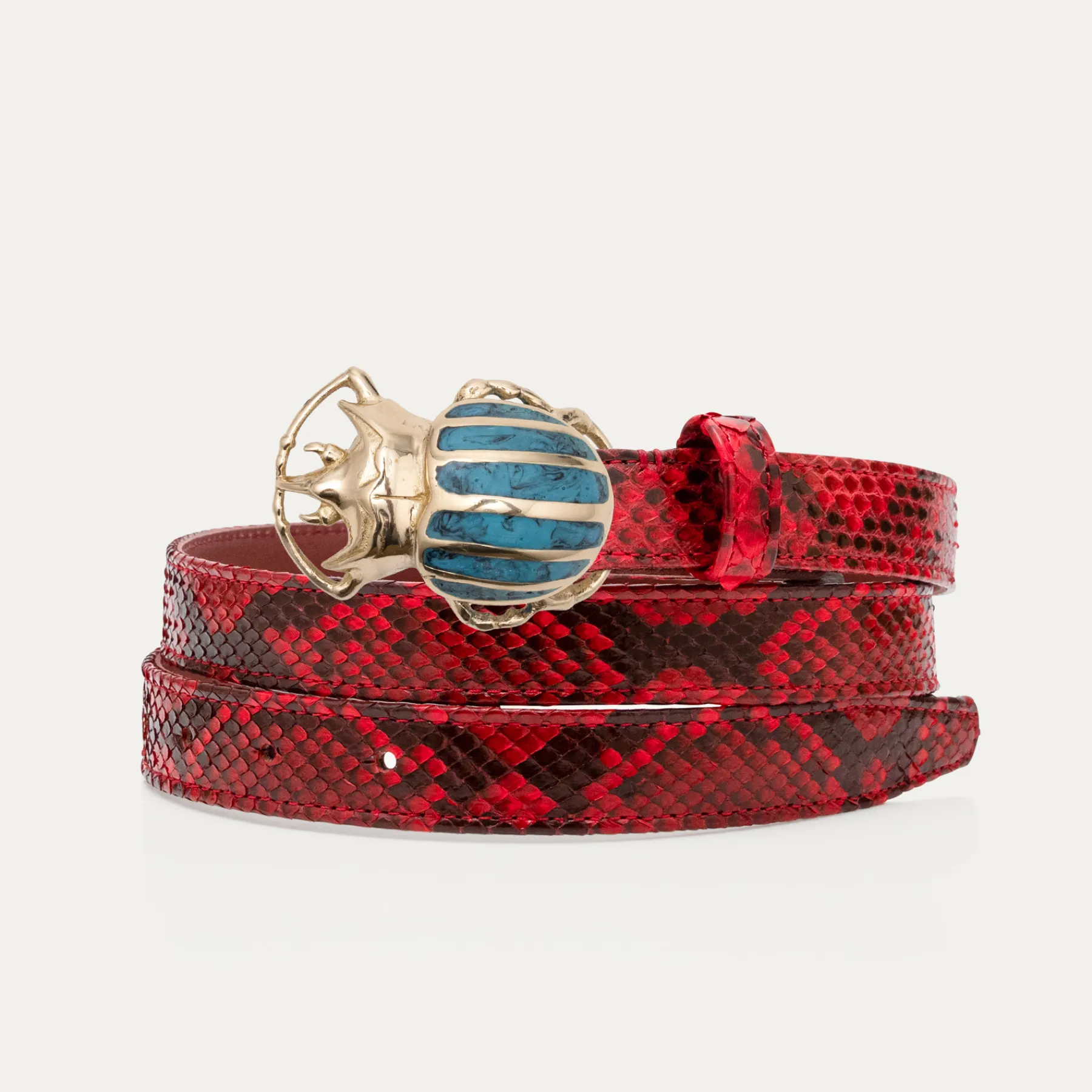 Ce ceinturon plus fin en python est doublé de cuir et orné d’une magnifique boucle en forme de scarabée. Elle donne un look fort aux tenues les plus simples.