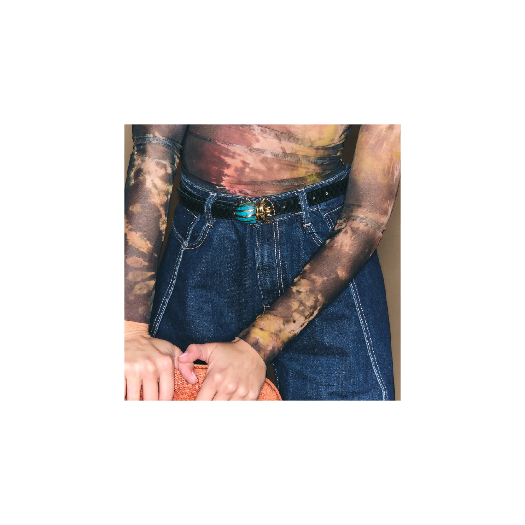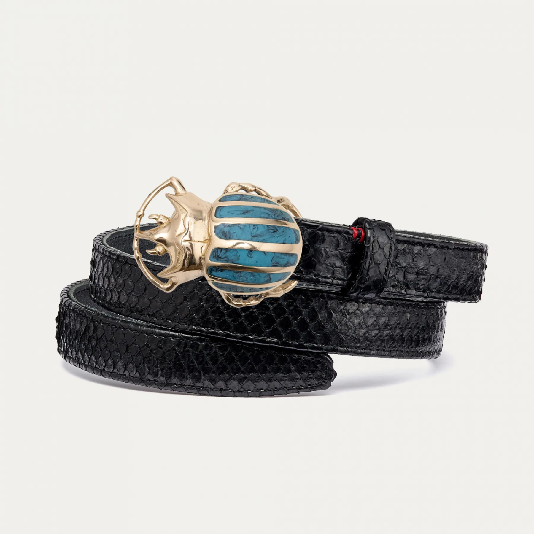 Ce ceinturon plus fin en python est doublé de cuir et orné d’une magnifique boucle en forme de scarabée. Elle donne…
