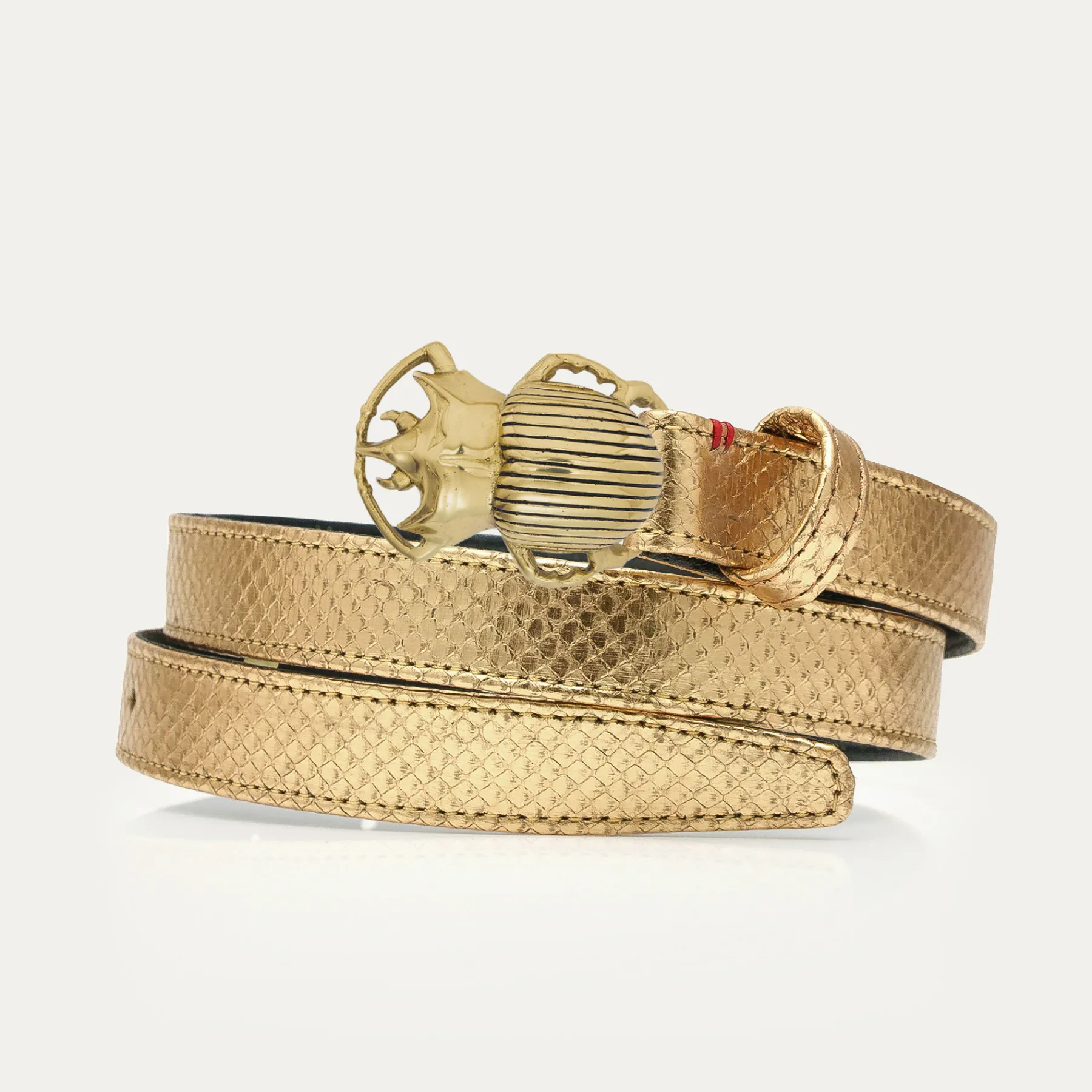 Ce ceinturon plus fin en python est doublé de cuir et orné d’une magnifique boucle en forme de scarabée. Elle donne…