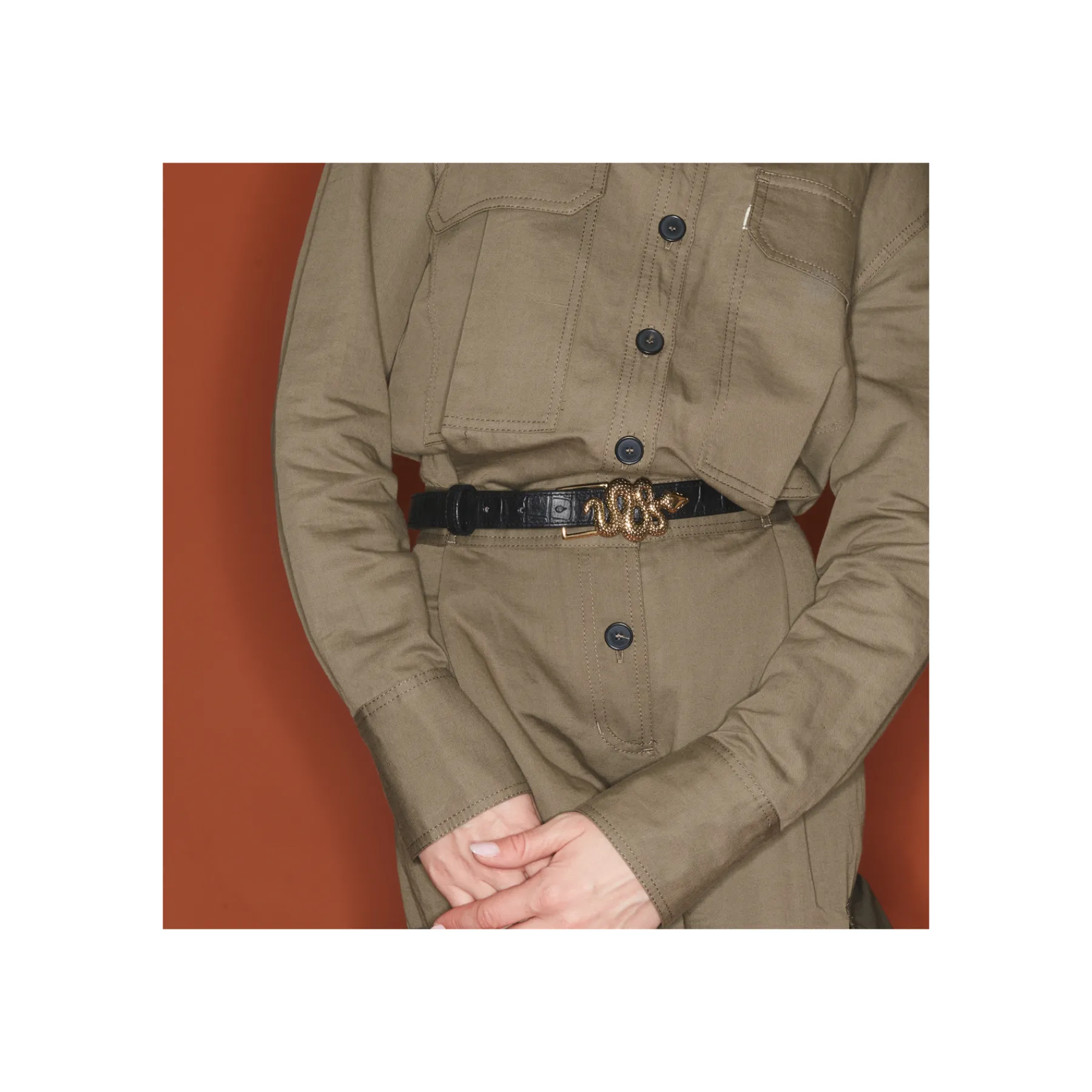 Ce ceinturon en python doublé de cuir est orné d’une magnifique boucle en forme de serpent. Elle donne un look fort aux tenues les plus simples.