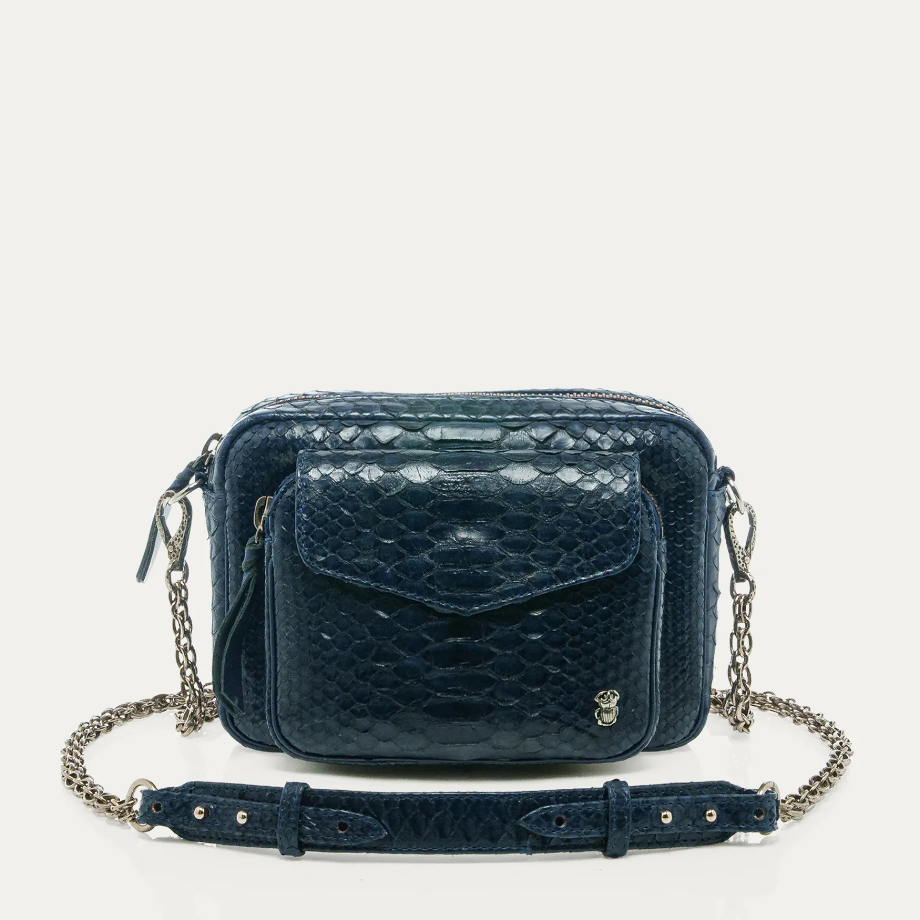 Ce sac porté croisé ou épaule est organisé en un compartiment avec une poche à l’avant. Notre Charly en python est muni d’une chaîne artisanale et de nombreux espaces de rangements qui vous facilitera la vie. Grâce à ses couleurs uniques, sa forme intemporelle, et son cuir souple notre Charly trouvera immédiatement sa place dans votre dressing !