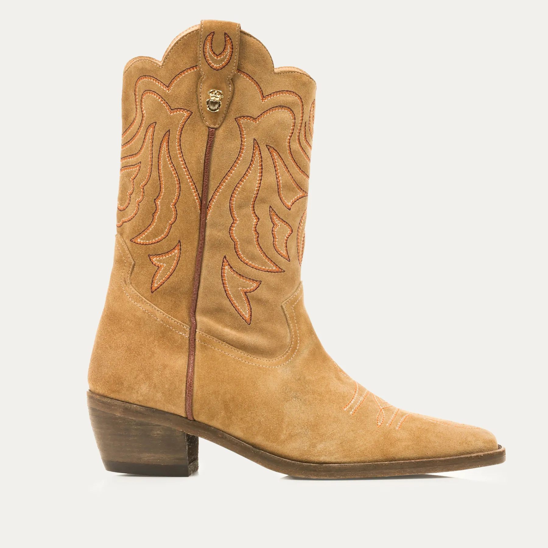 Nos bottes Lucienne feront votre look à elles seules ! Avec son bout pointu et son petit talon, craquez pour le look santiag moderne. Inspirées des années 70, ces bottes s’accorderont à vos robes et vos jeans.