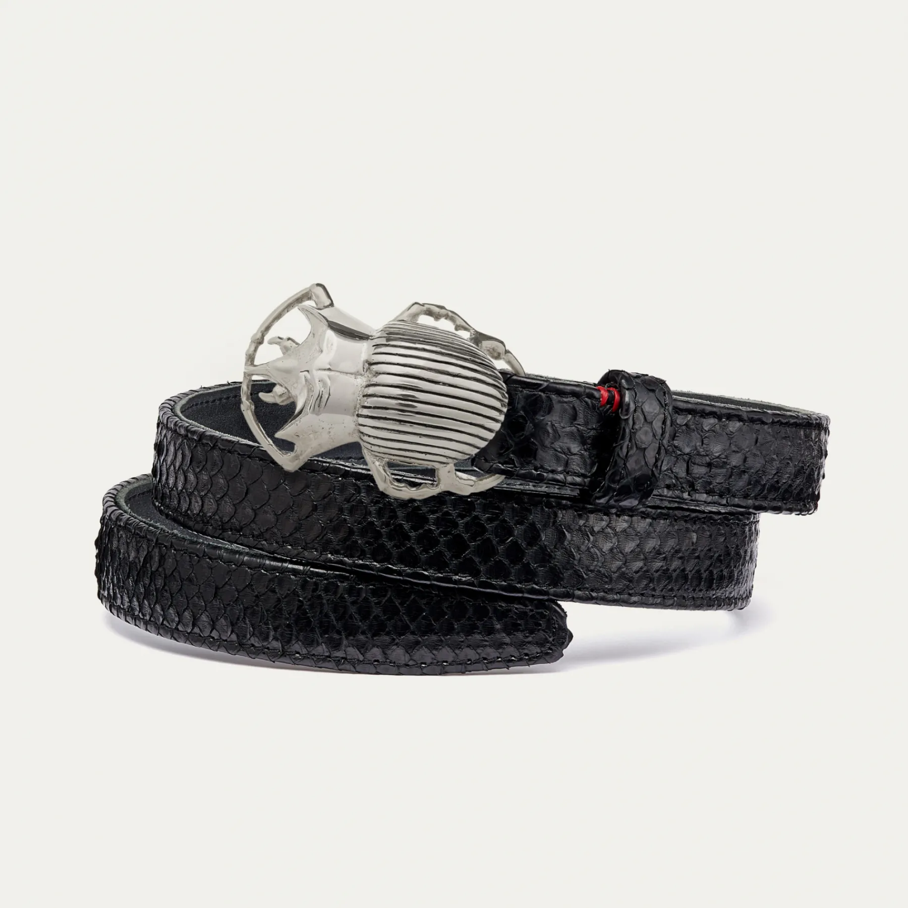 Ce ceinturon plus fin en python est doublé de cuir et orné d’une magnifique boucle en forme de scarabée. Elle donne…