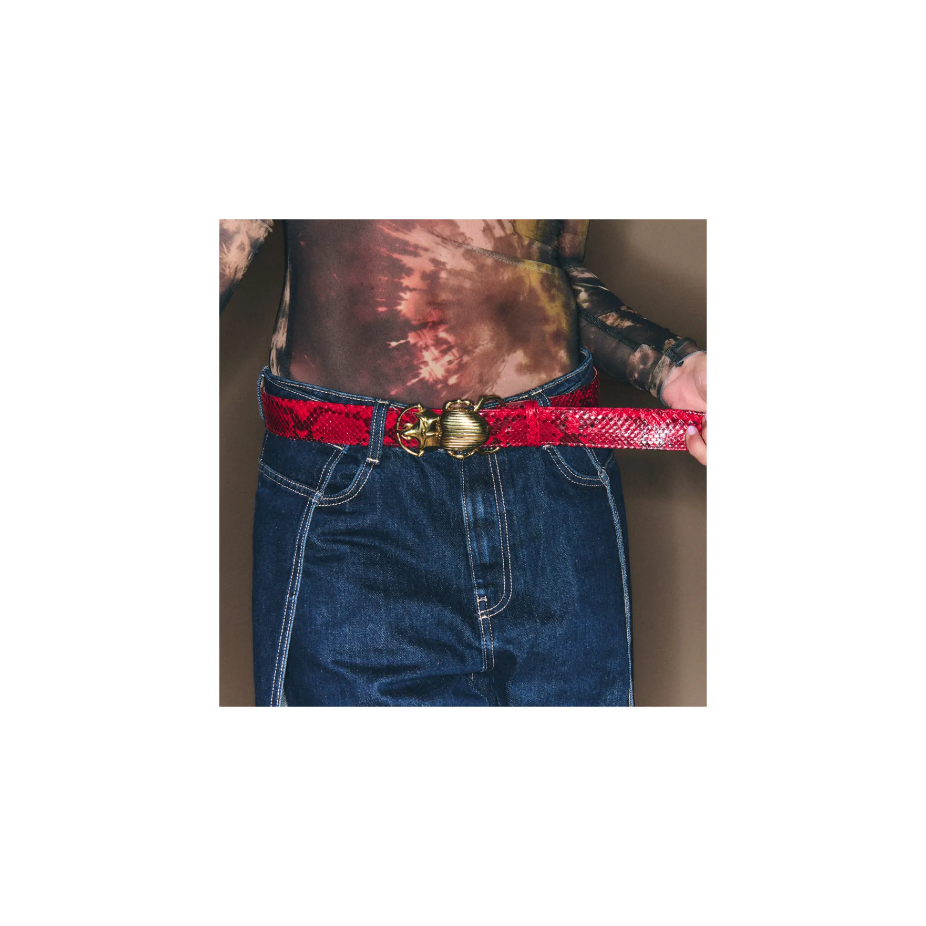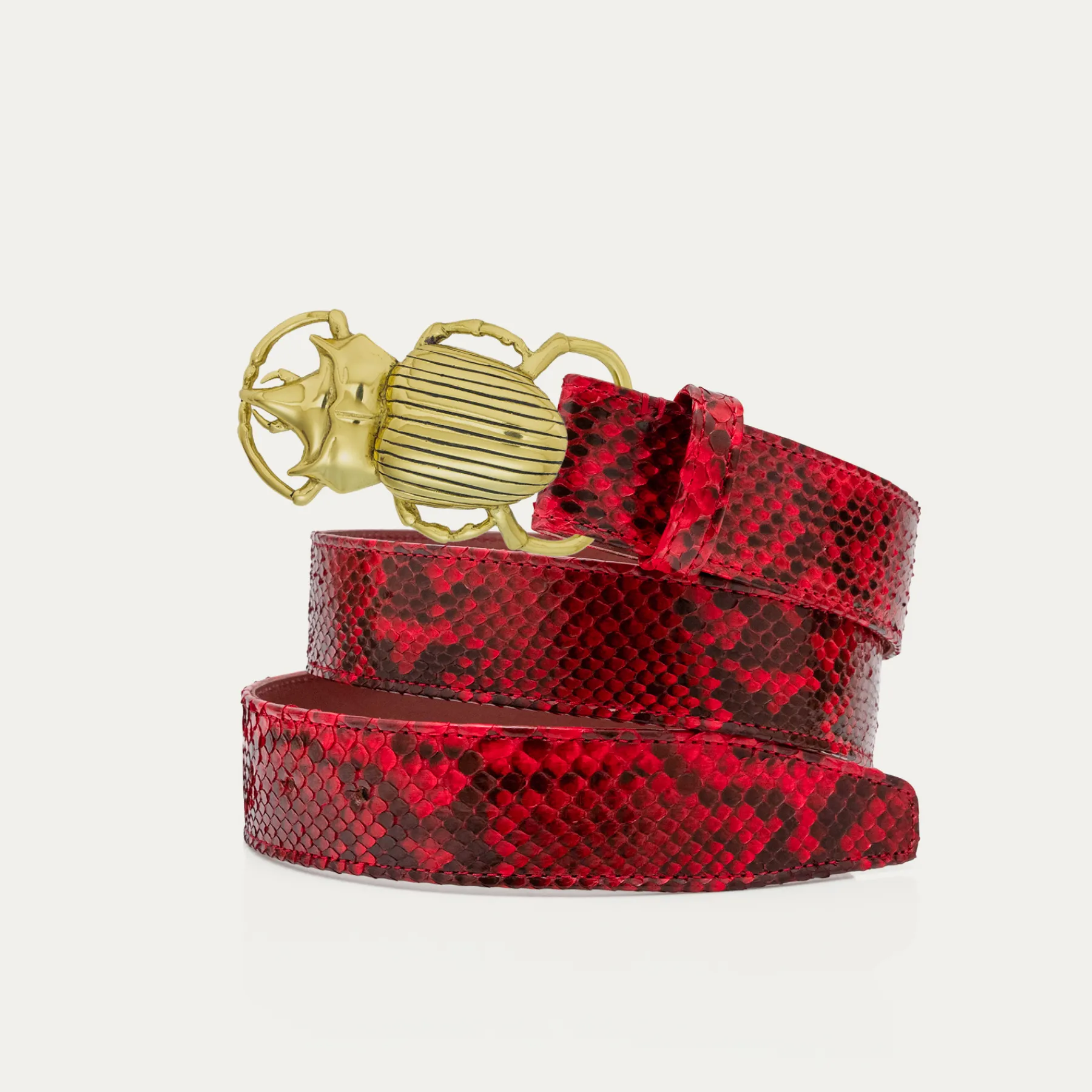 Ce ceinturon, doublé de cuir est orné d’une magnifique boucle en forme de scarabée. Elle donne un look fort aux tenues les plus simples.