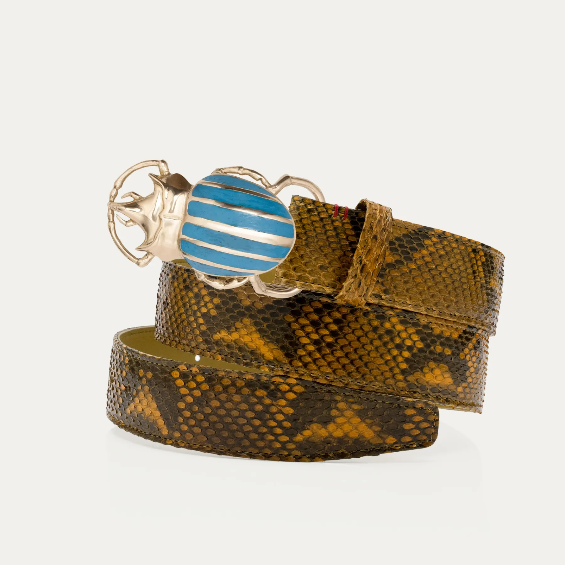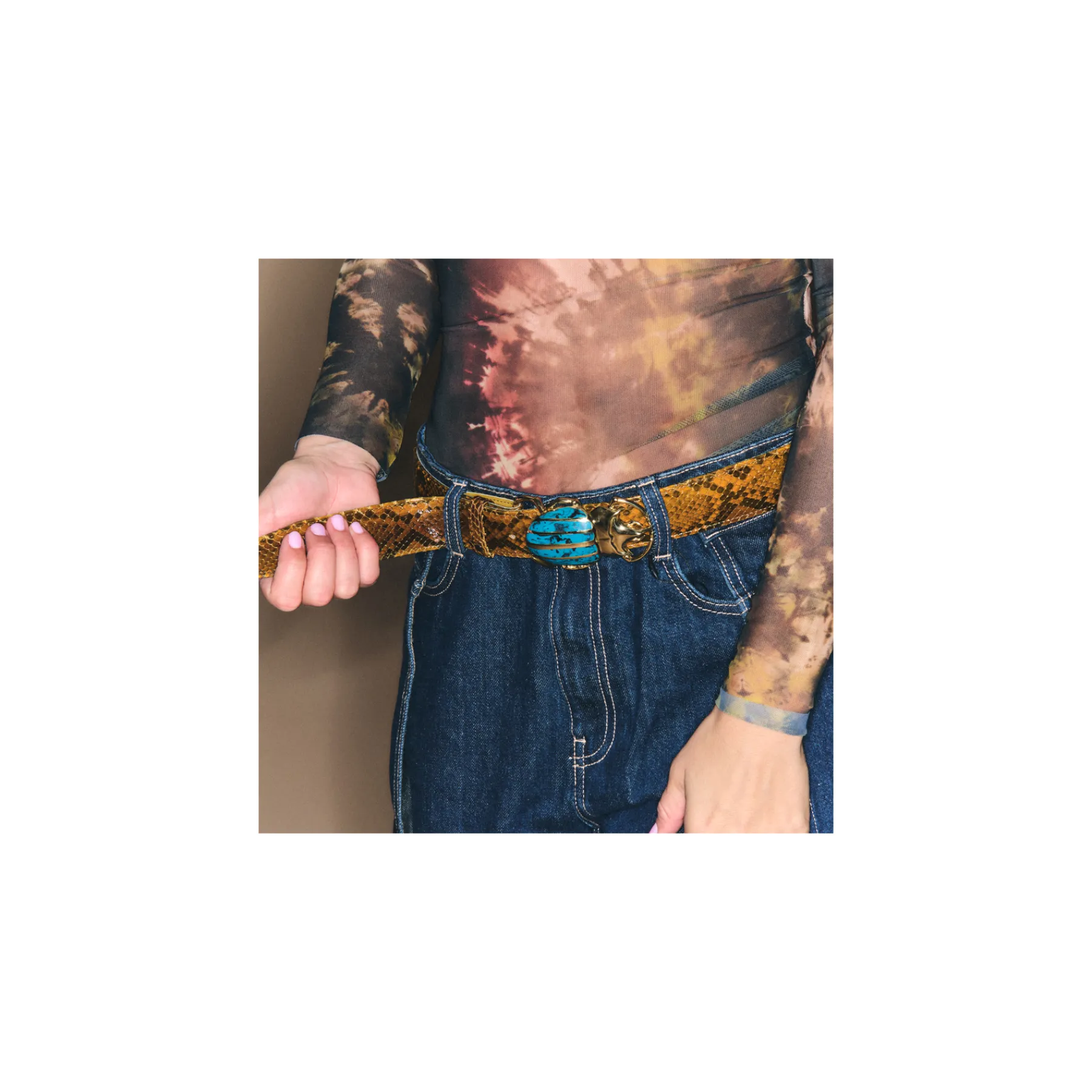 Ce ceinturon, doublé de cuir est orné d’une magnifique boucle en forme de scarabée. Elle donne un look fort aux tenue…