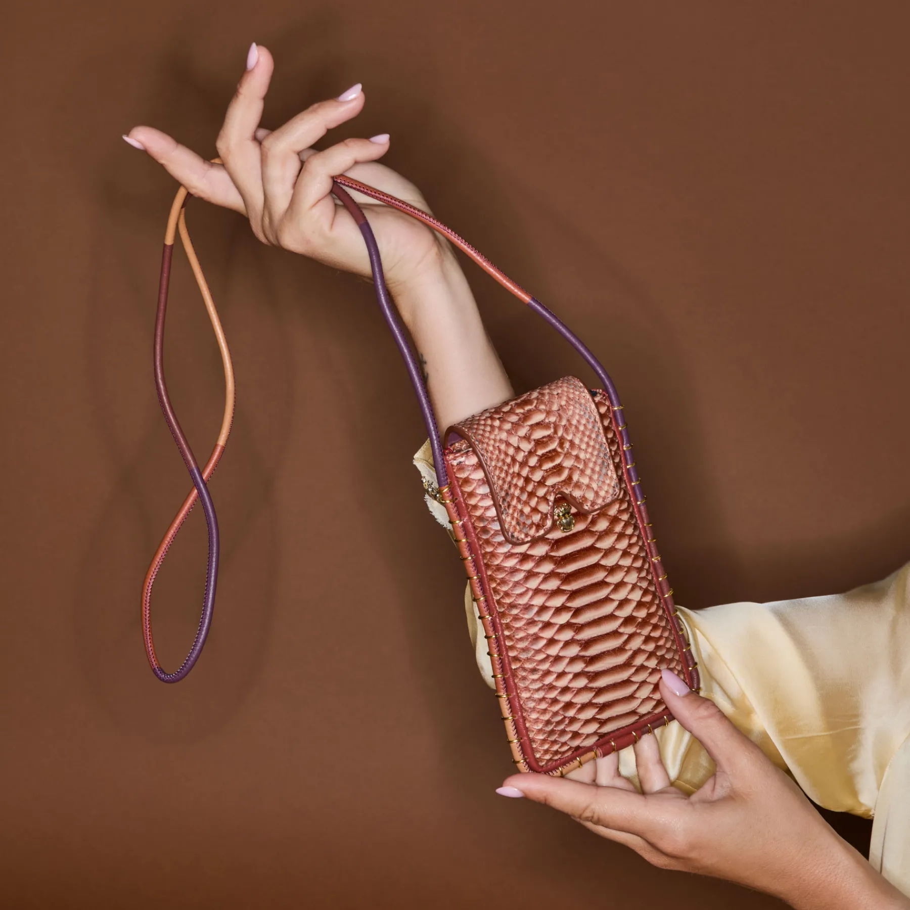Notre étui à lunettes Émile a été réalisé à la main et confectionné en python. Doté d’une poche principale, il se ferme à l’aide d’un rabat aimanté, orné d’un mini scarabée. Émile possède également 3 fentes à l’arrière de sa pochette, afin que vous puissiez ranger vos cartes sans difficulté. Grâce à sa corde en cuir, vous pourrez le porter en cross body ou bien autour du cou.