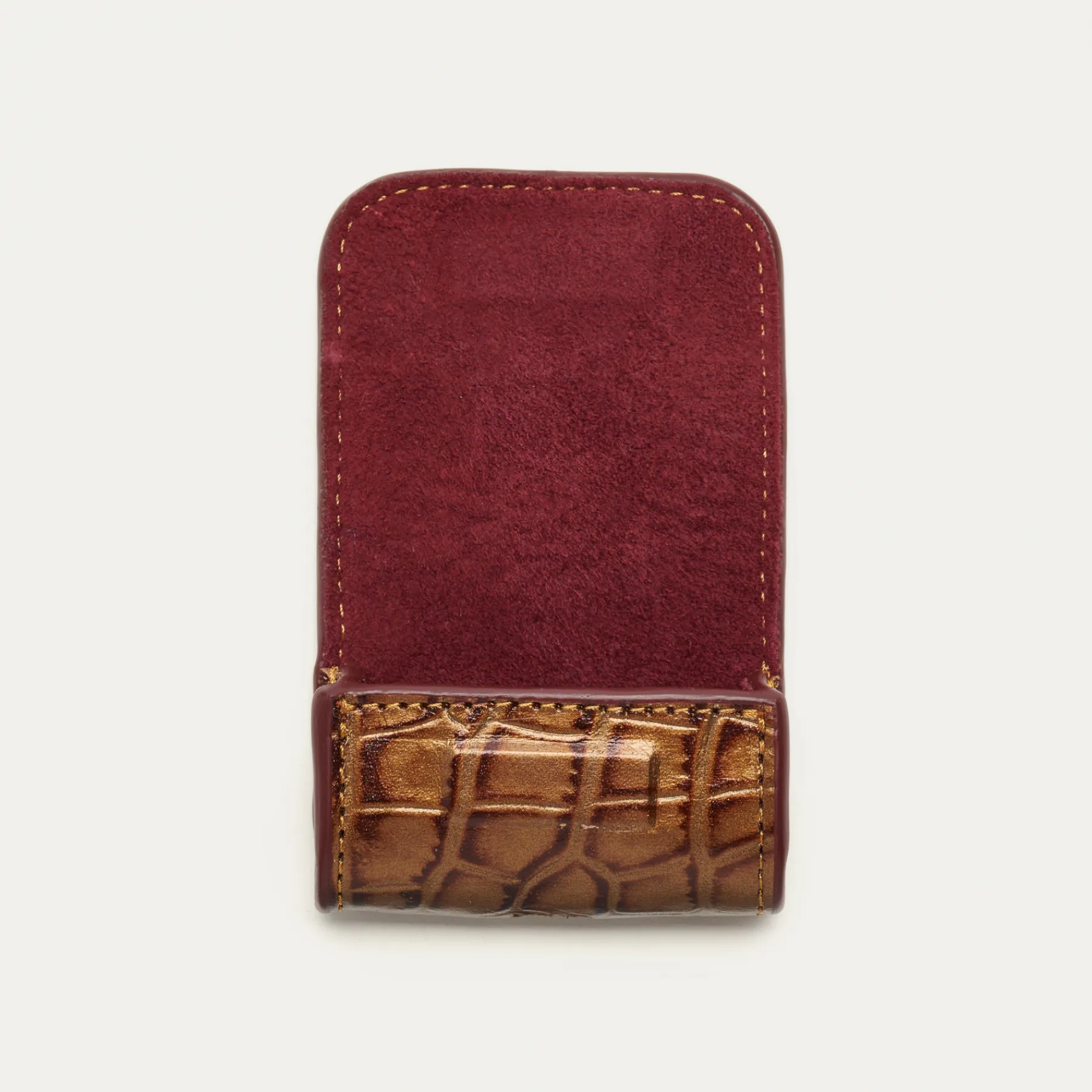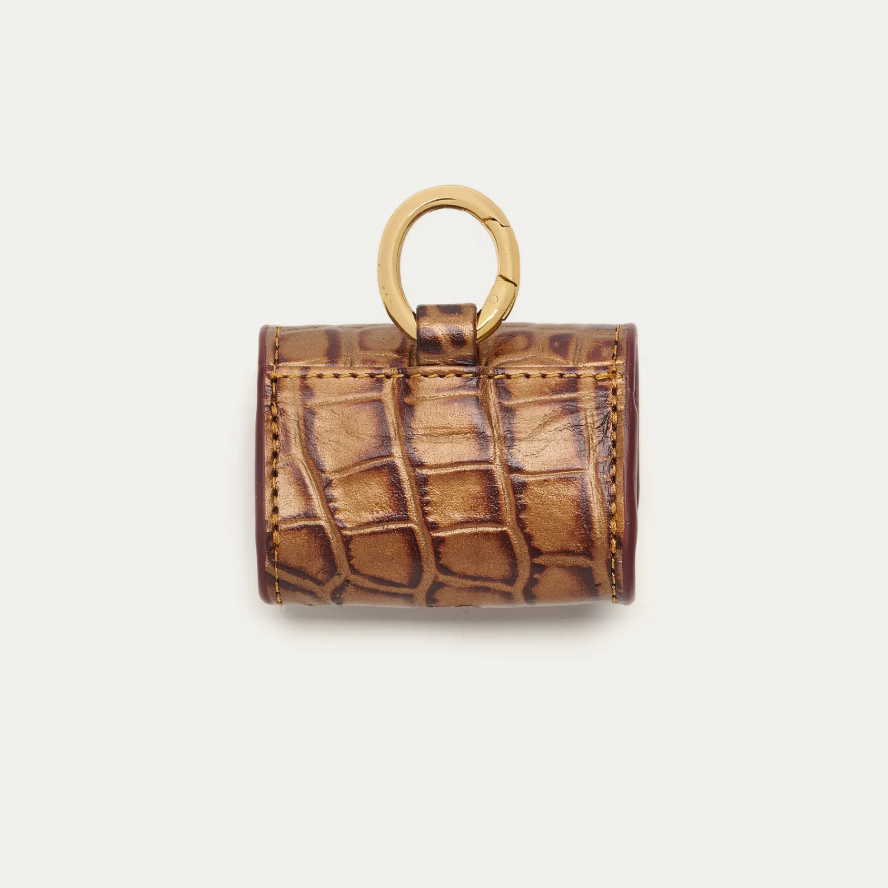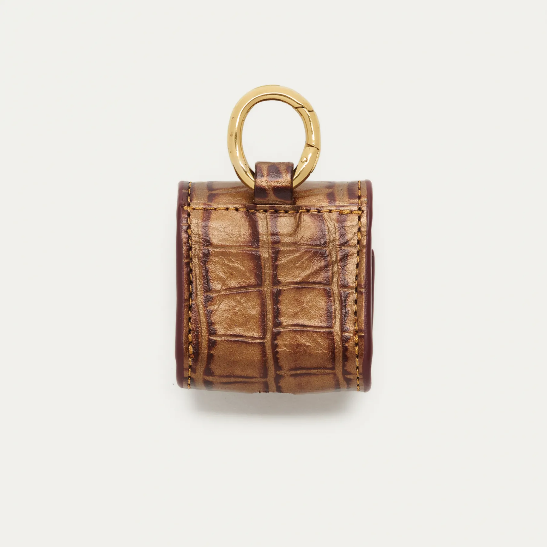 Notre premier étui à AirPods Jamie entièrement composé de cuir embossé croco écorce est orné d’une beetle dorée à l’avant. Son mousqueton vous permettra de l’accrocher aussi bien à vos passants de pantalon, qu’à votre sac ou étui de téléphone portable, tel que notre Double Marcus.