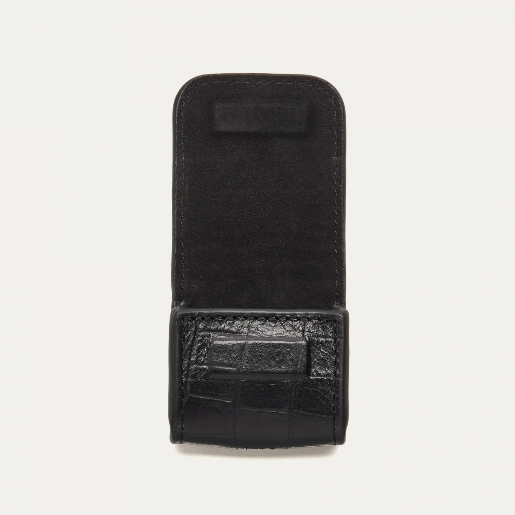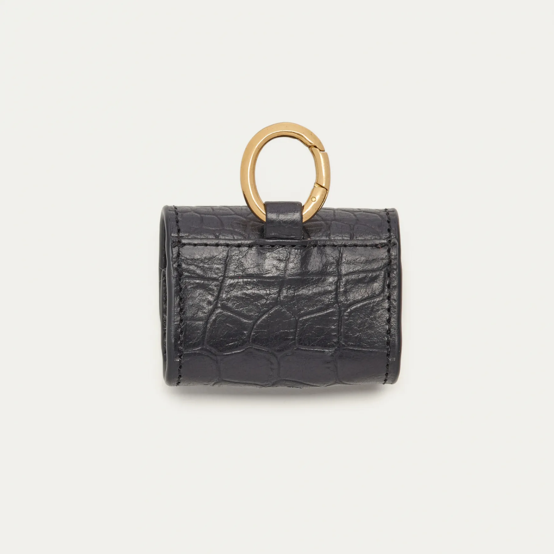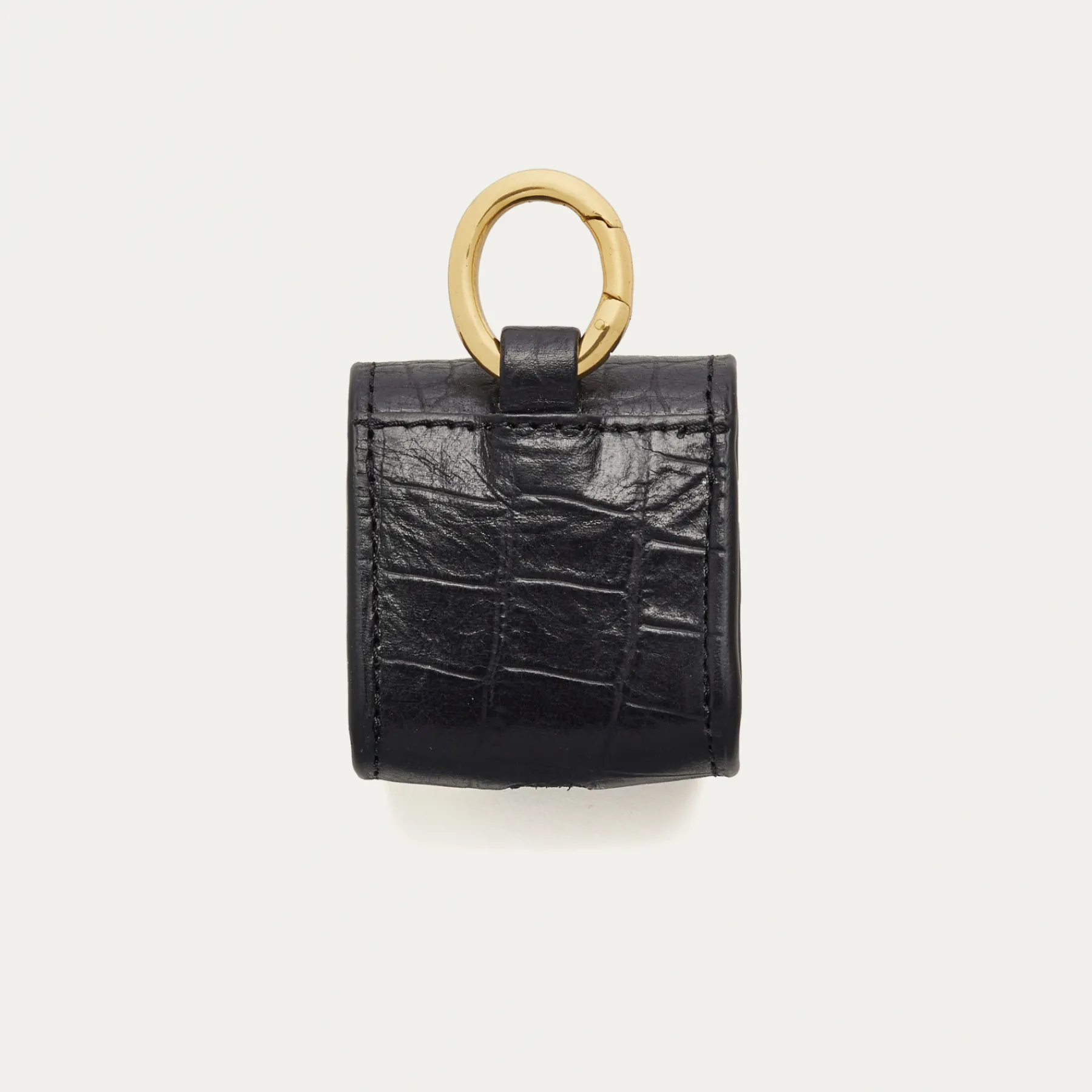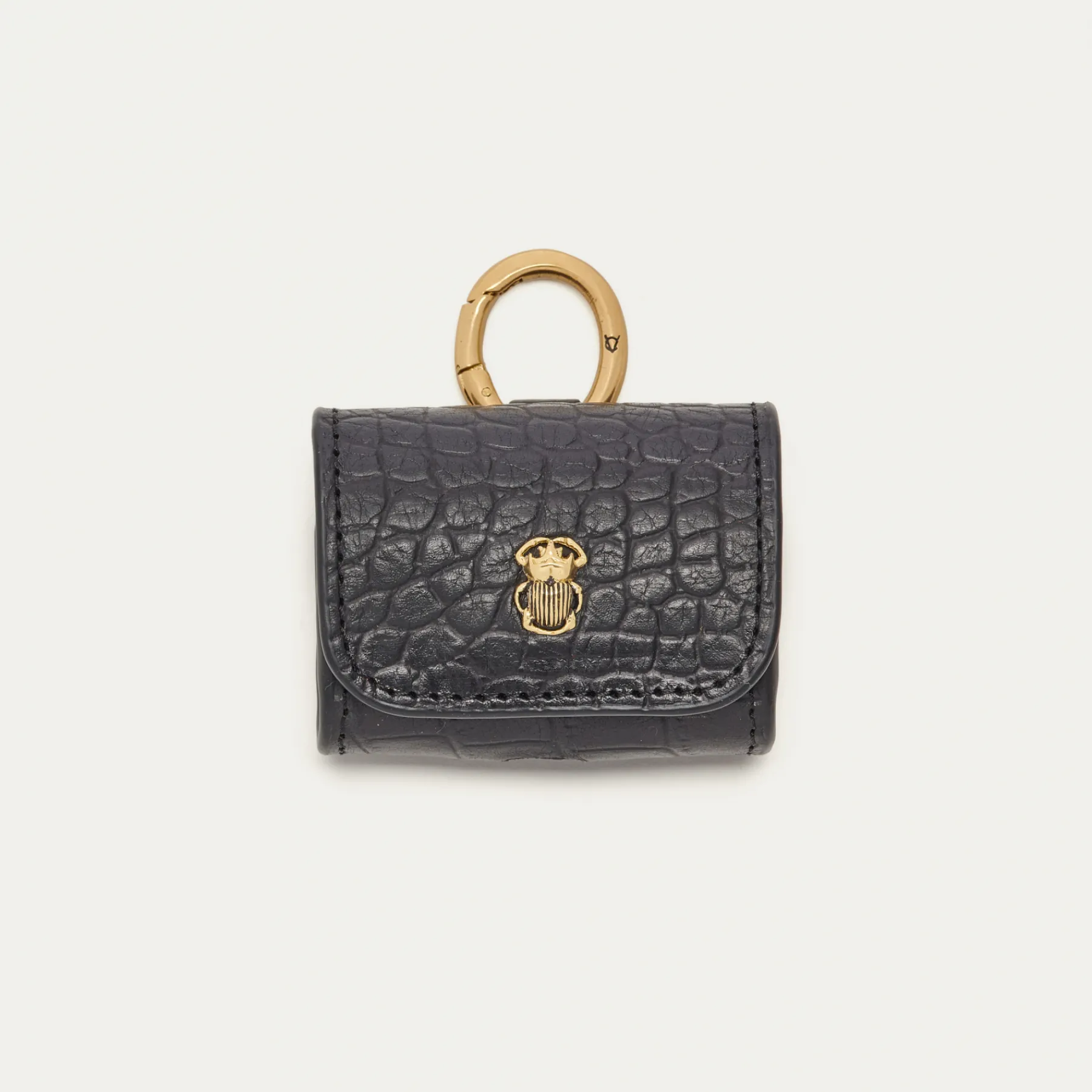 Notre premier étui à AirPods Jamie entièrement composé de cuir embossé crocro est orné d’une beetle dorée à l’avant. Son mousqueton vous permettra de l’accrocher aussi bien à vos passants de pantalon, qu’à votre sac ou étui de téléphone portable, tel que notre Double Marcus.