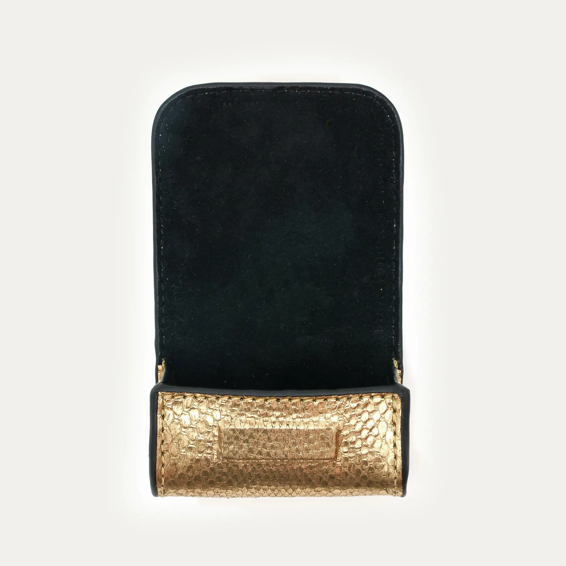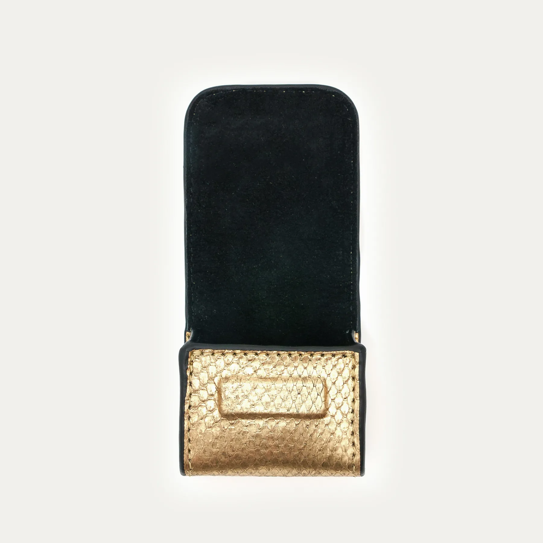 Notre premier étui à AirPods Jamie entièrement composé de python est orné d’une beetle dorée à l’avant. Son mousq…