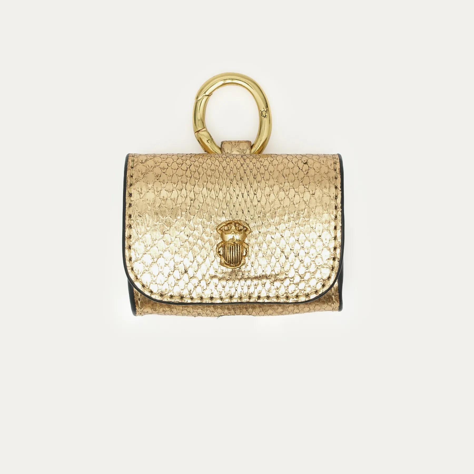 Notre premier étui à AirPods Jamie entièrement composé de python est orné d’une beetle dorée à l’avant. Son mousqueton vous permettra de l’accrocher aussi bien à vos passants de pantalon, qu’à votre sac ou étui de téléphone portable, tel que notre Double Marcus.