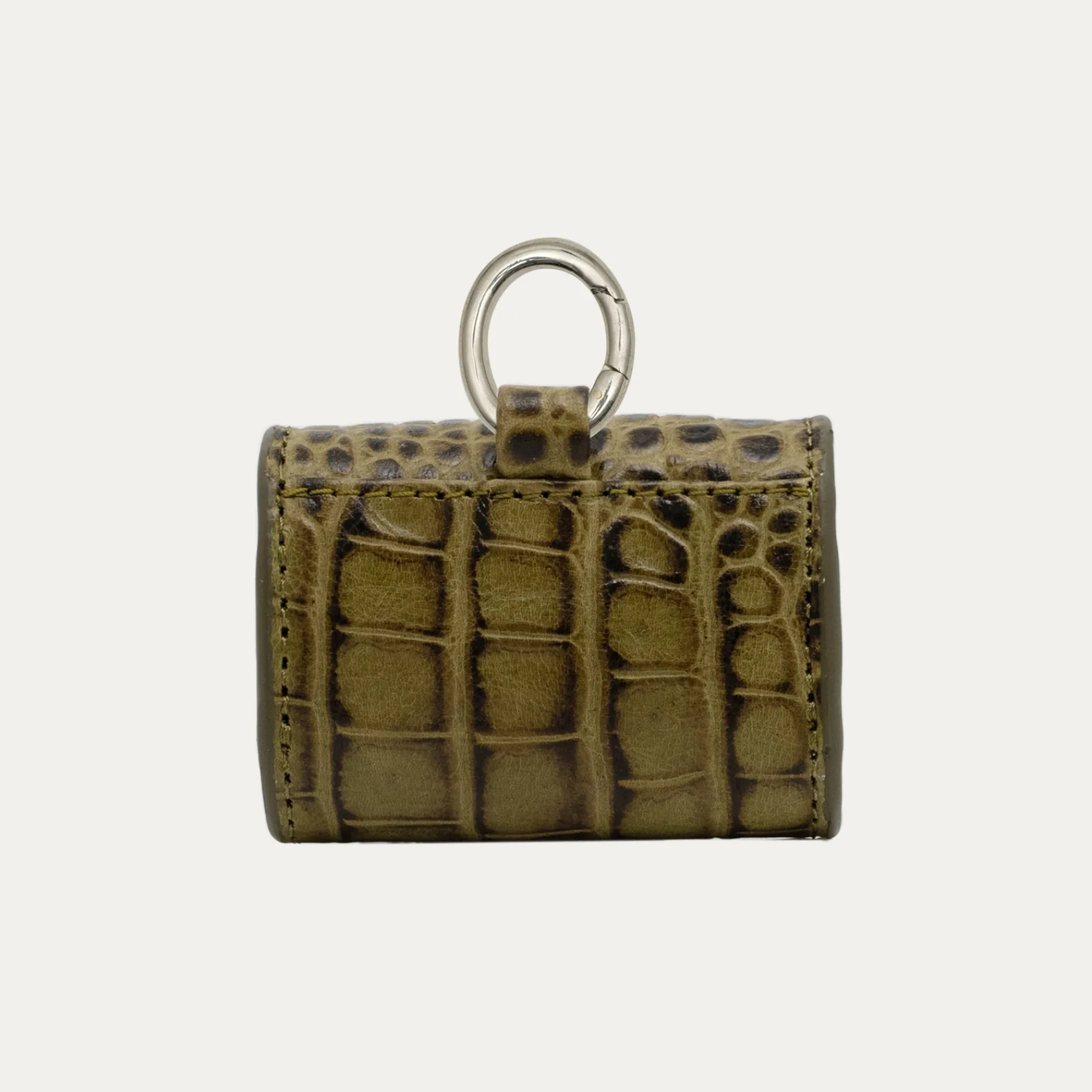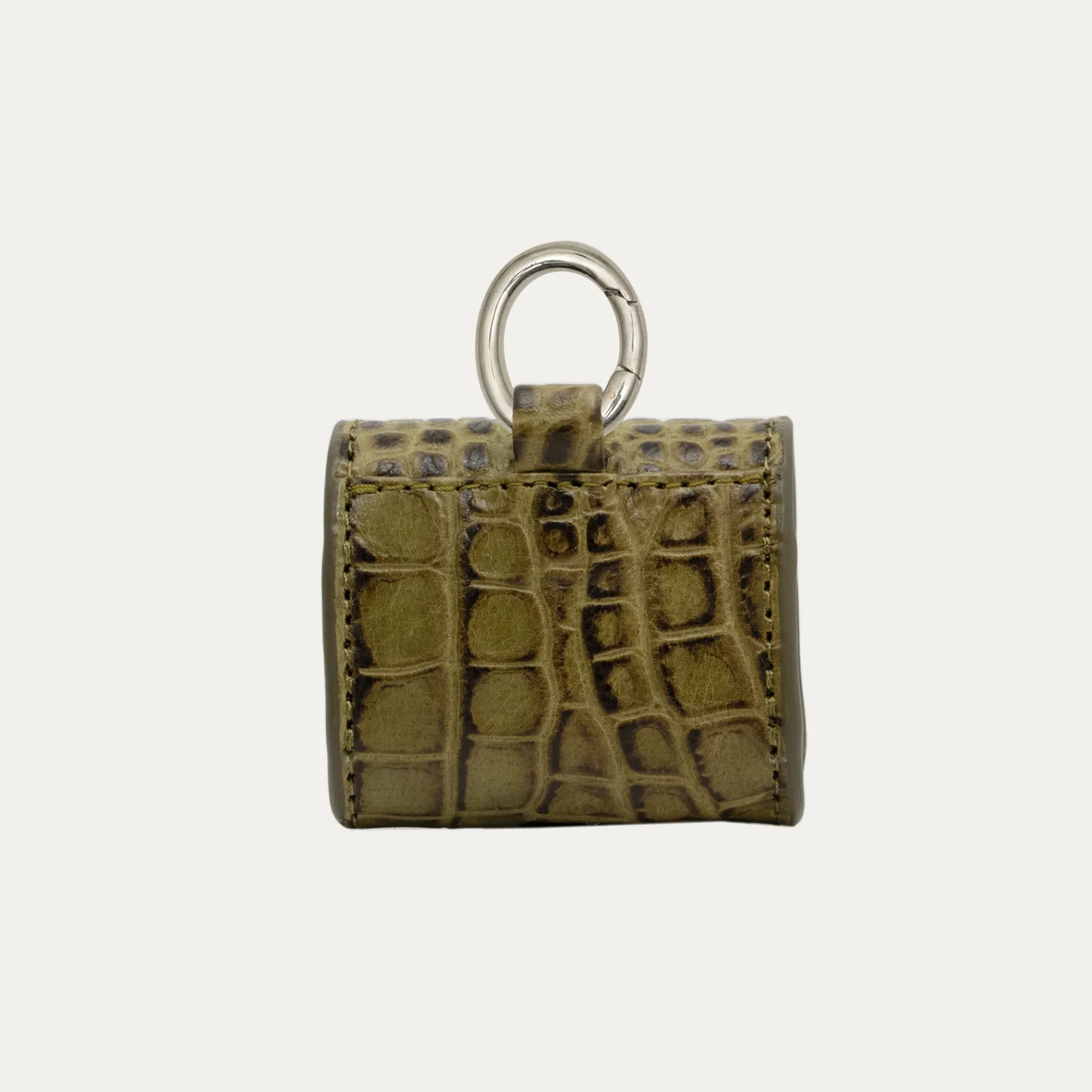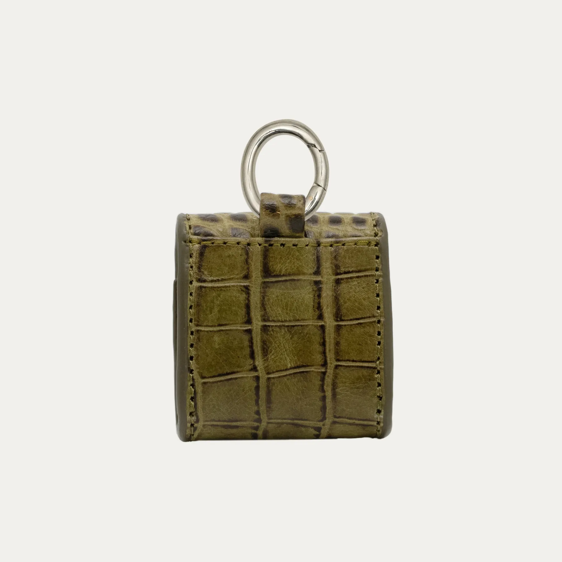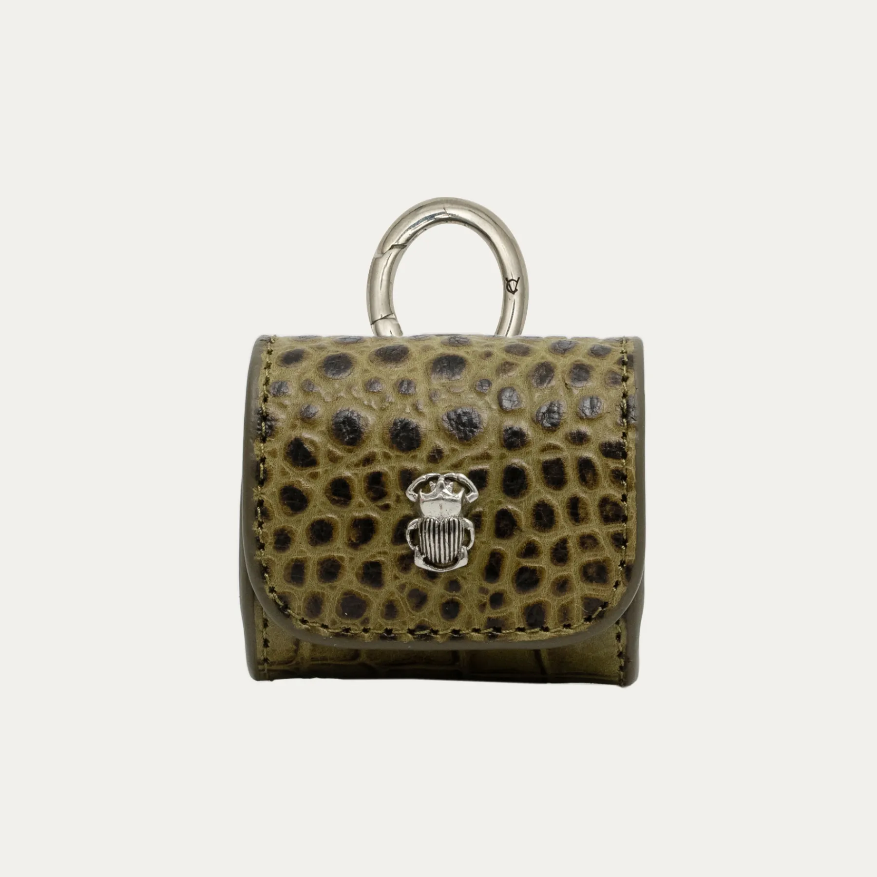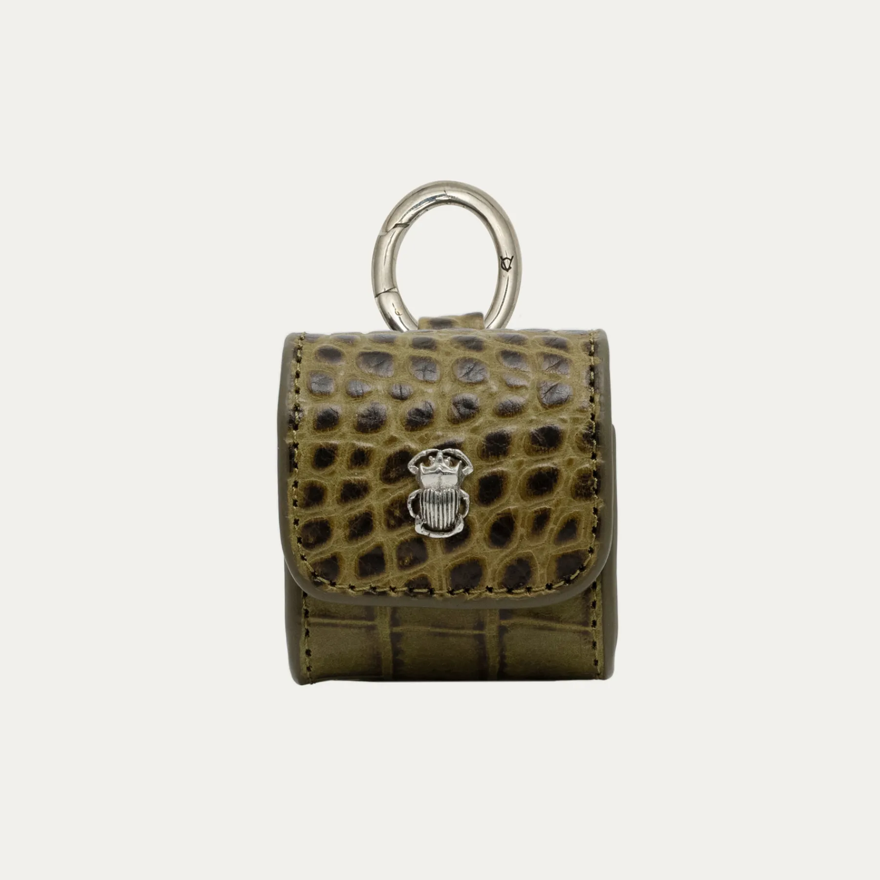 Notre premier étui à AirPods Jamie entièrement composé de cuir embossé croco est orné d’une beetle argenté à l’avant. Son mousqueton vous permettra de l’accrocher aussi bien à vos passants de pantalon, qu’à votre sac ou étui de téléphone portable, tel que notre Double Marcus.