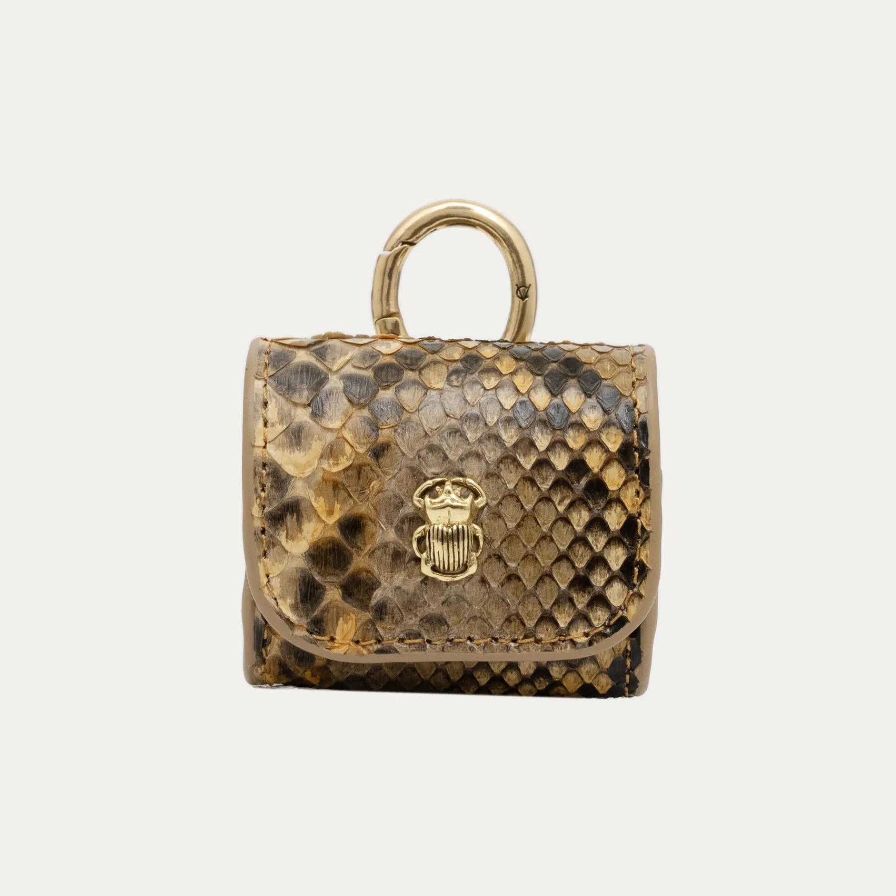 Notre premier étui à AirPods Jamie entièrement composé de python est orné d’une beetle dorée à l’avant. Son mousq…