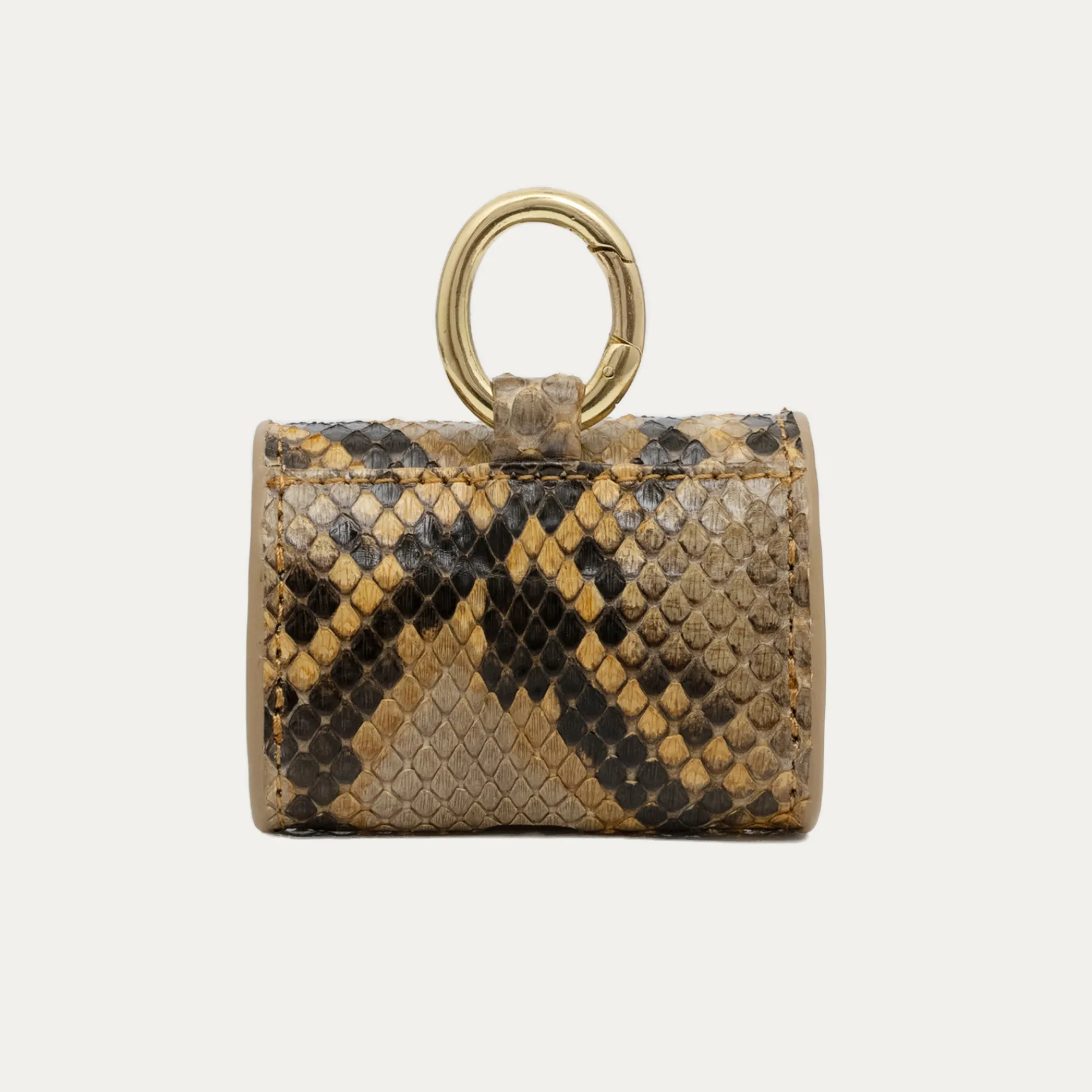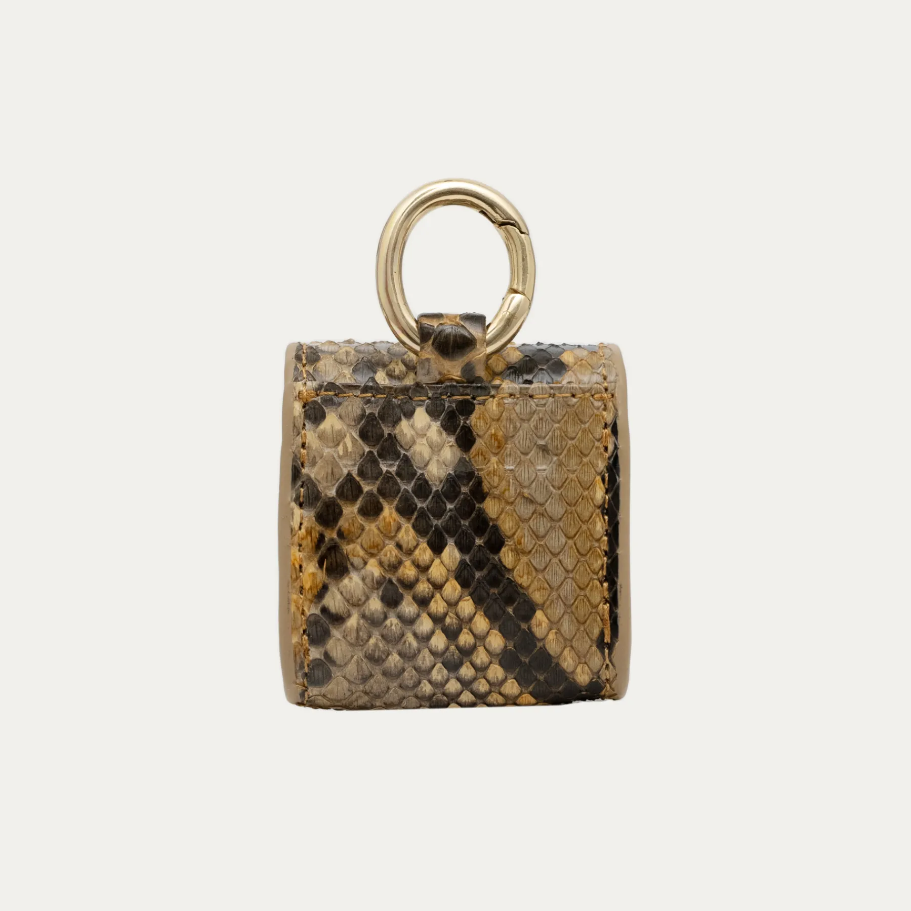 Notre premier étui à AirPods Jamie entièrement composé de python est orné d’une beetle dorée à l’avant. Son mousqueton vous permettra de l’accrocher aussi bien à vos passants de pantalon, qu’à votre sac ou étui de téléphone portable, tel que notre Double Marcus.