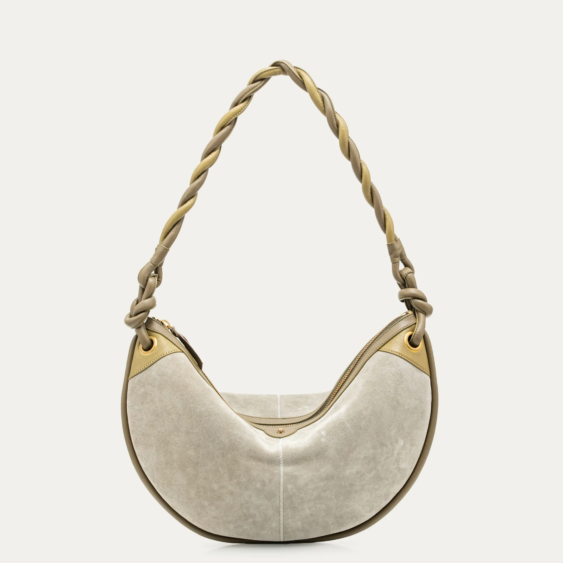 Notre nouveau sac demi-lune Chris est composé de cuir vintage. Son anse, entrelacée par de gros noeuds en cuir, p…
