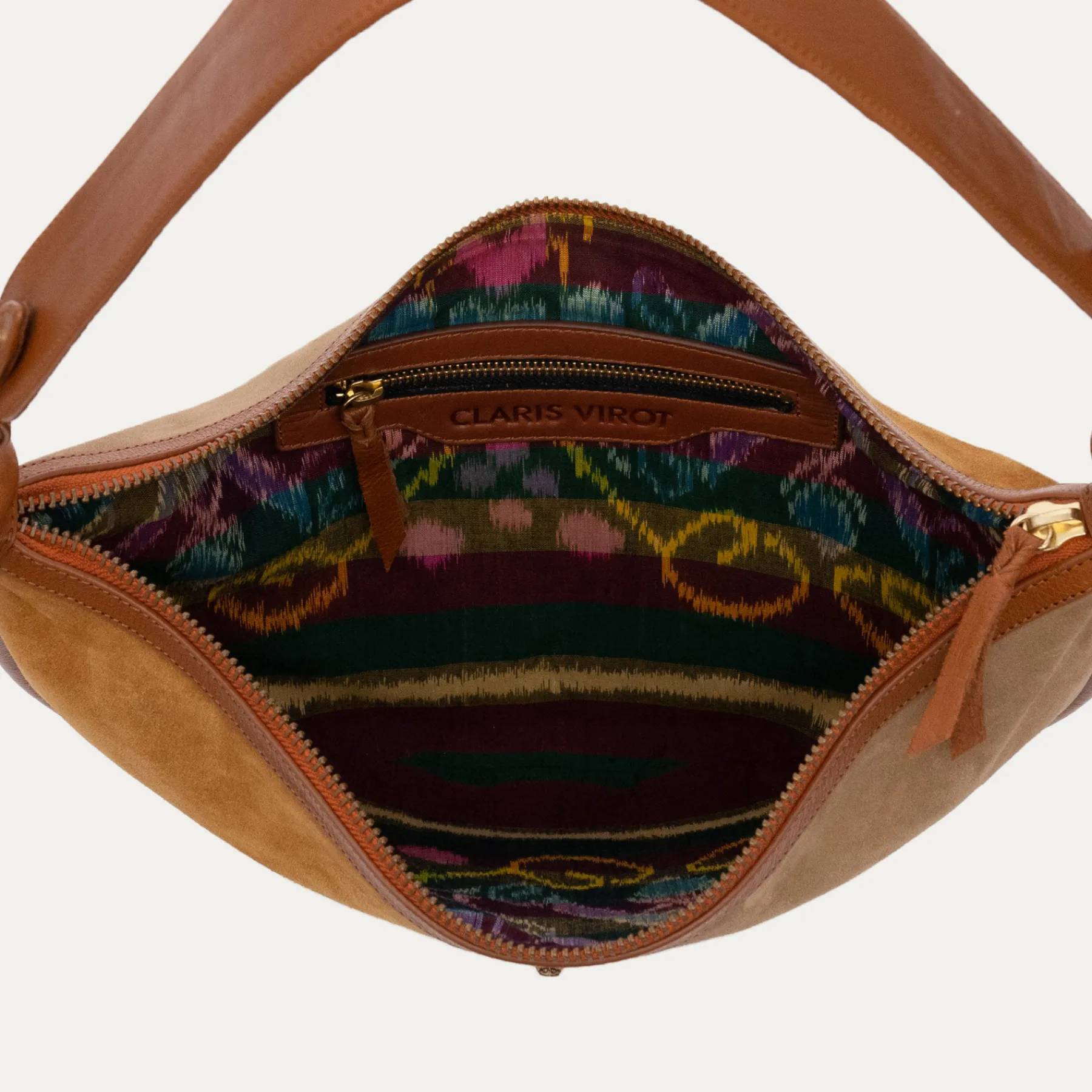 Notre sac demi-lune Chris est composé de veau velours, bicolore.