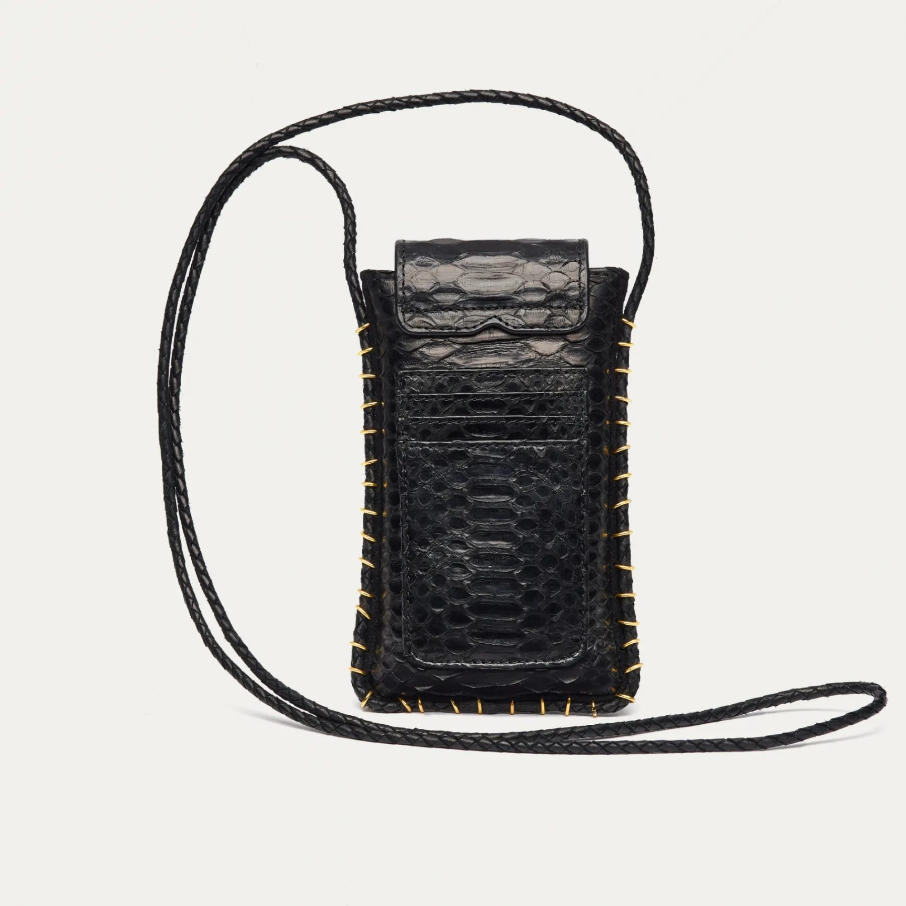 Notre étui à lunettes Émile a été réalisé à la main et confectionné en python. Doté d’une poche principale, il se ferme à l’aide d’un rabat aimanté, orné d’un mini scarabée. Émile possède également 3 fentes à l’arrière de sa pochette, afin que vous puissiez ranger vos cartes sans difficulté. Grâce à sa corde en cuir, vous pourrez le porter en cross body ou bien autour du cou.