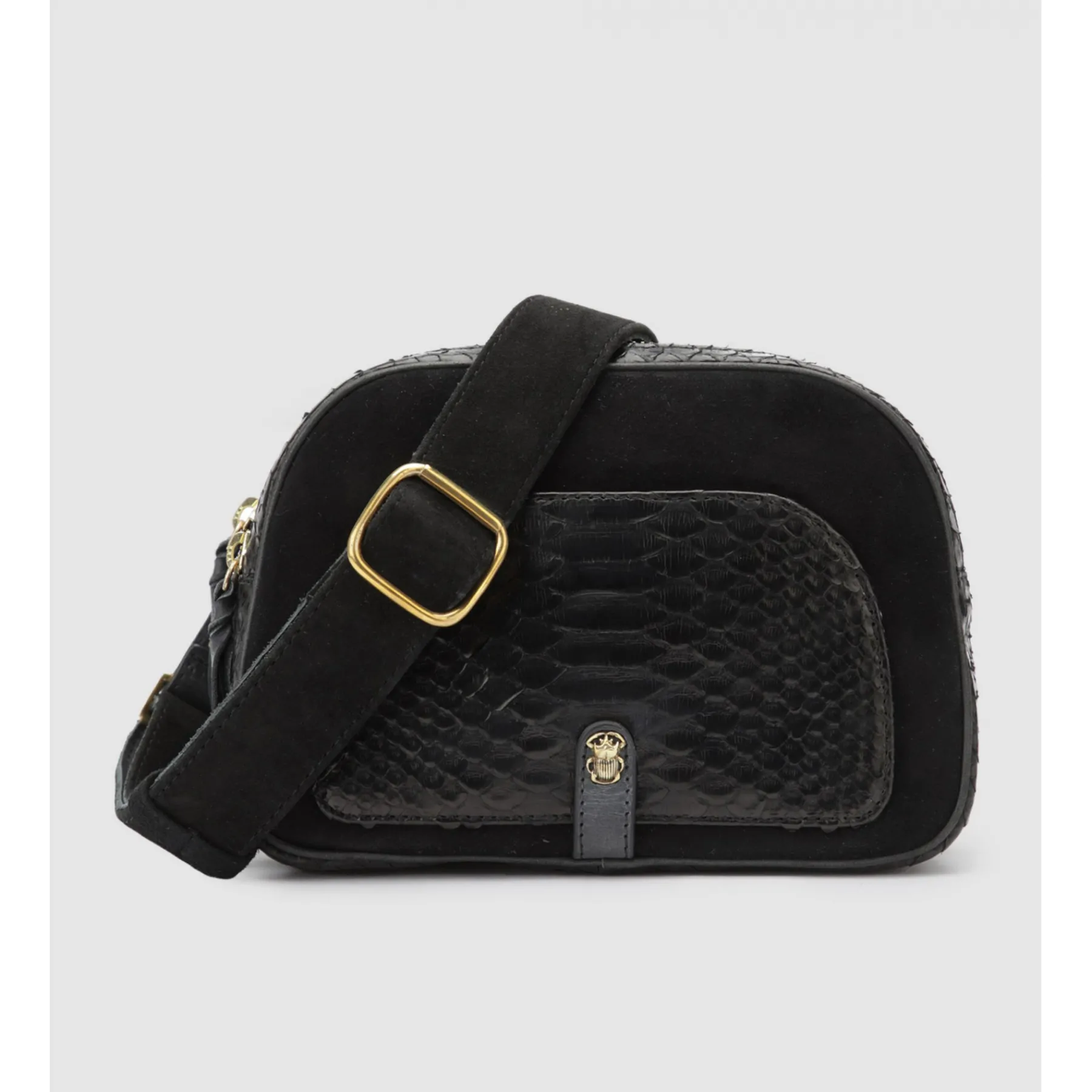 Ce nouveau sac à la forme demi lune est composé de python et daim. Porté épaule ou croisé, notre modèle Clara est organisé en deux compartiments avec une poche interne zipée ainsi qu’une poche à l’avant ornée d’un bijou en laiton prenant la forme d’un scarabée. À l’arrière, 3 fentes vous permettront d’y rangers cartes et papiers. À la fois petit et pratique, notre nouveau modèle Clara apportera une touche de modernité à vos tenues les plus simples.