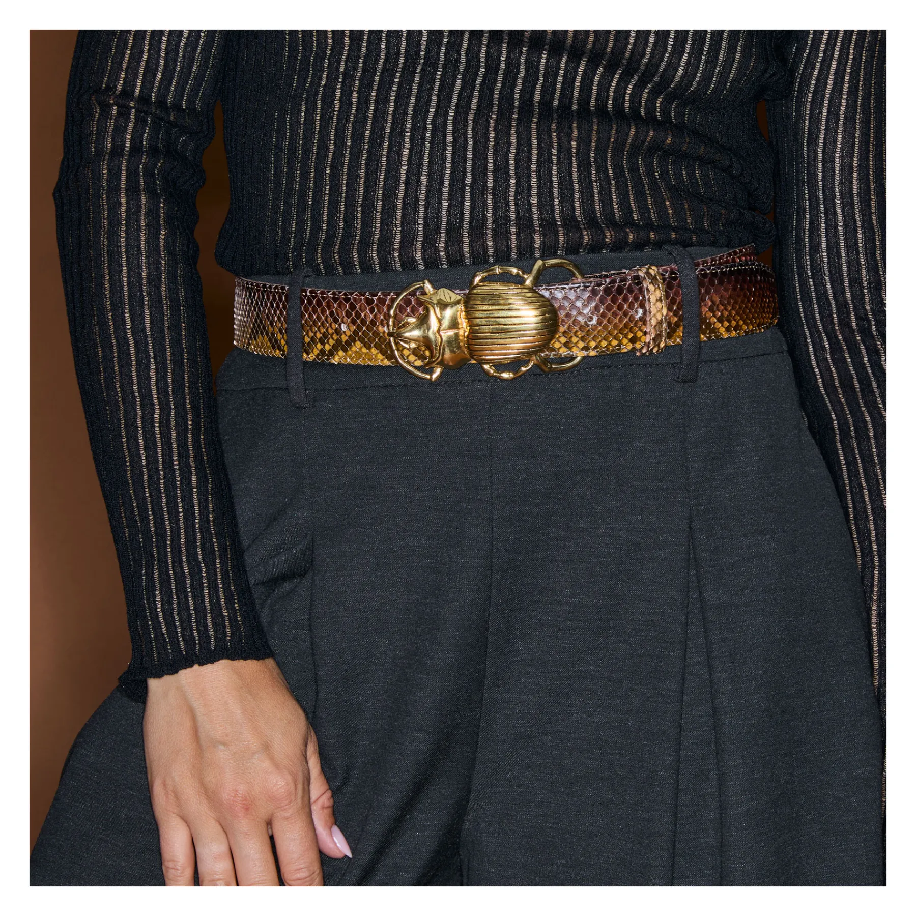 Ce ceinturon, doublé de cuir est orné d’une magnifique boucle en forme de scarabée. Elle donne un look fort aux tenues les plus simples.