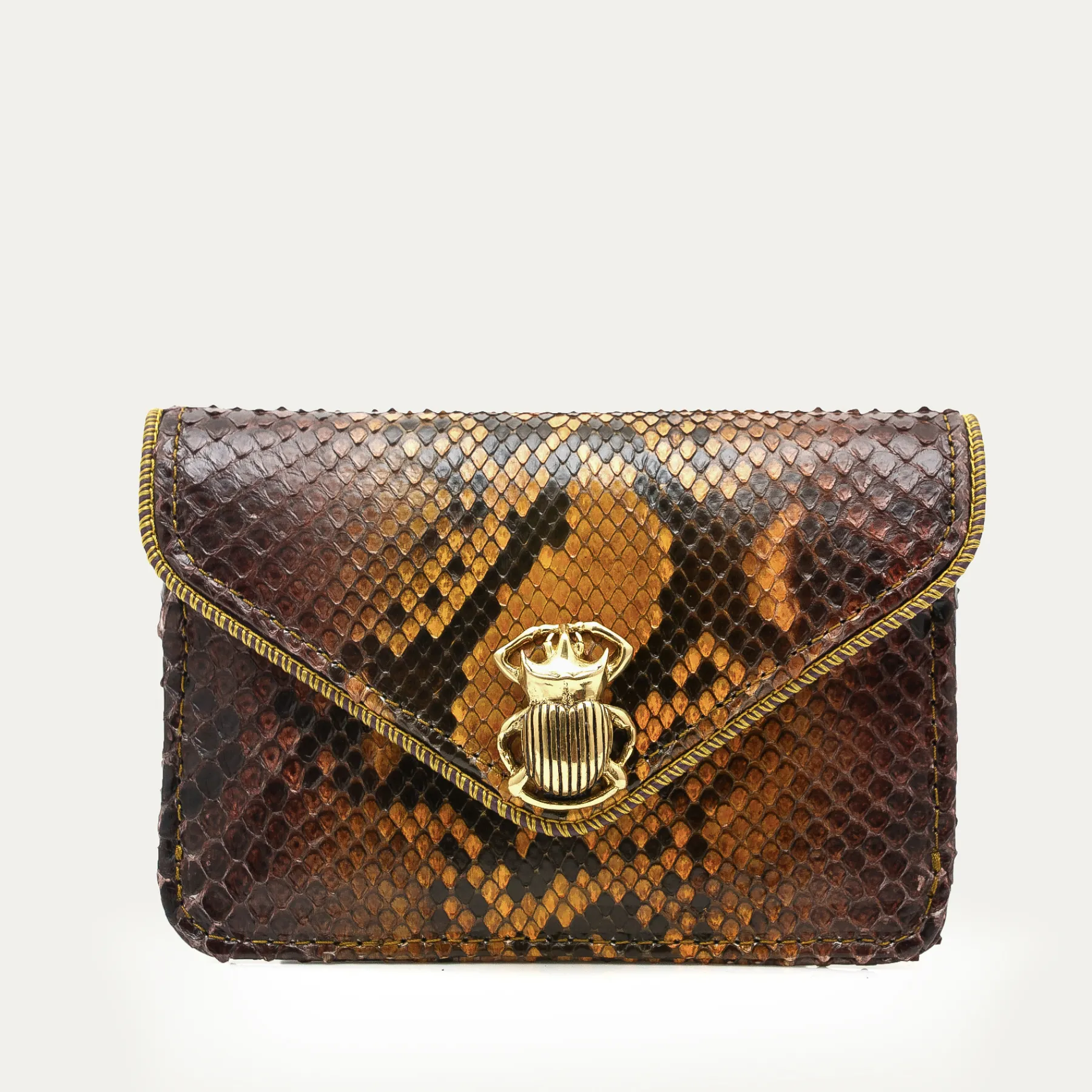 Cette petite pochette en python qui prend la forme d’une enveloppe est ornée d’un fermoir en forme de scarabée en laiton. Parfaite pour garder tous vos petits papiers et votre monnaie grâce à ses différents compartiments, elle se glissera facilement dans tous vos sacs.
