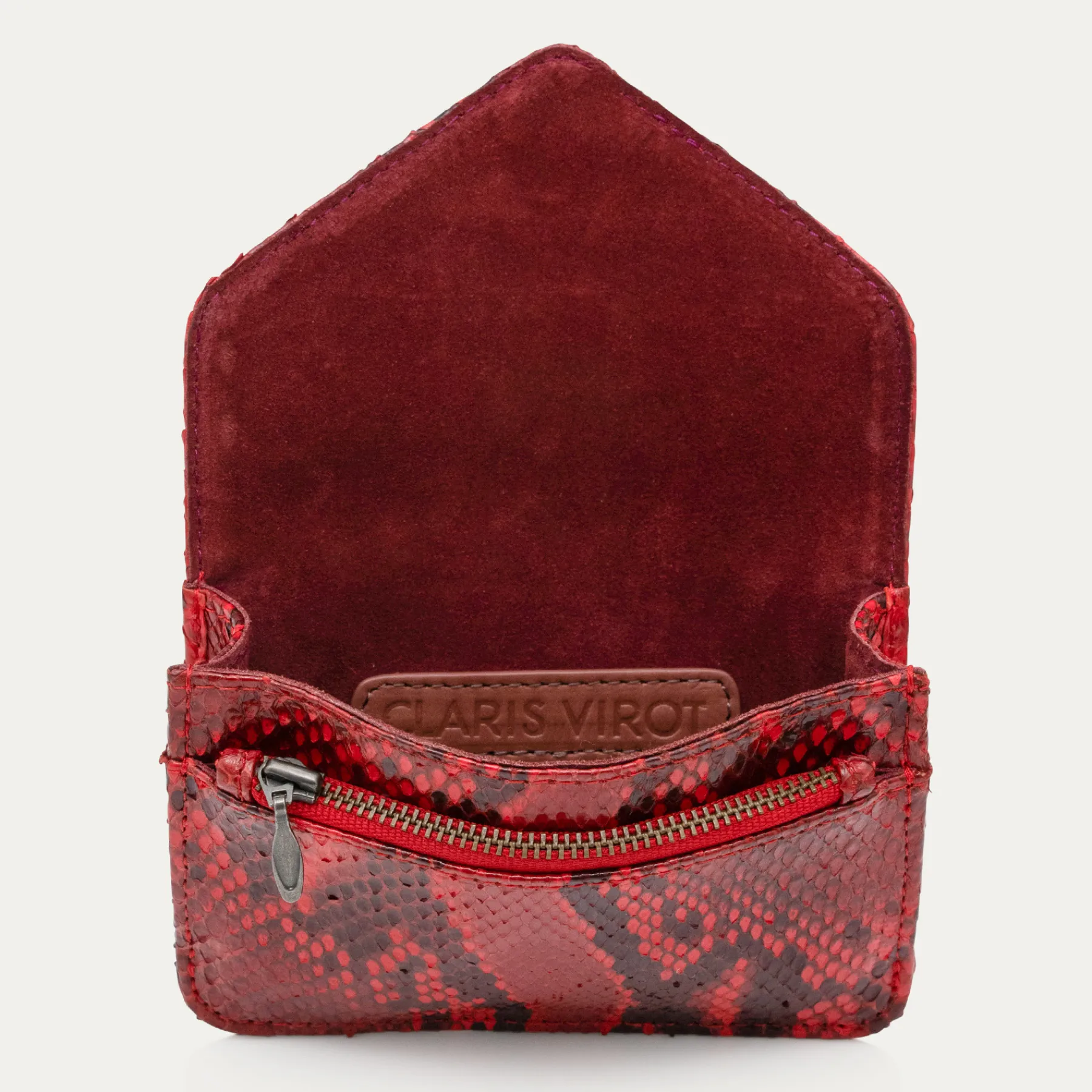 Cette petite pochette en python qui prend la forme d’une enveloppe est ornée d’un fermoir en forme de scarabée en laiton. Parfaite pour garder tous vos petits papiers et votre monnaie grâce à ses différents compartiments, elle se glissera facilement dans tous vos sacs.