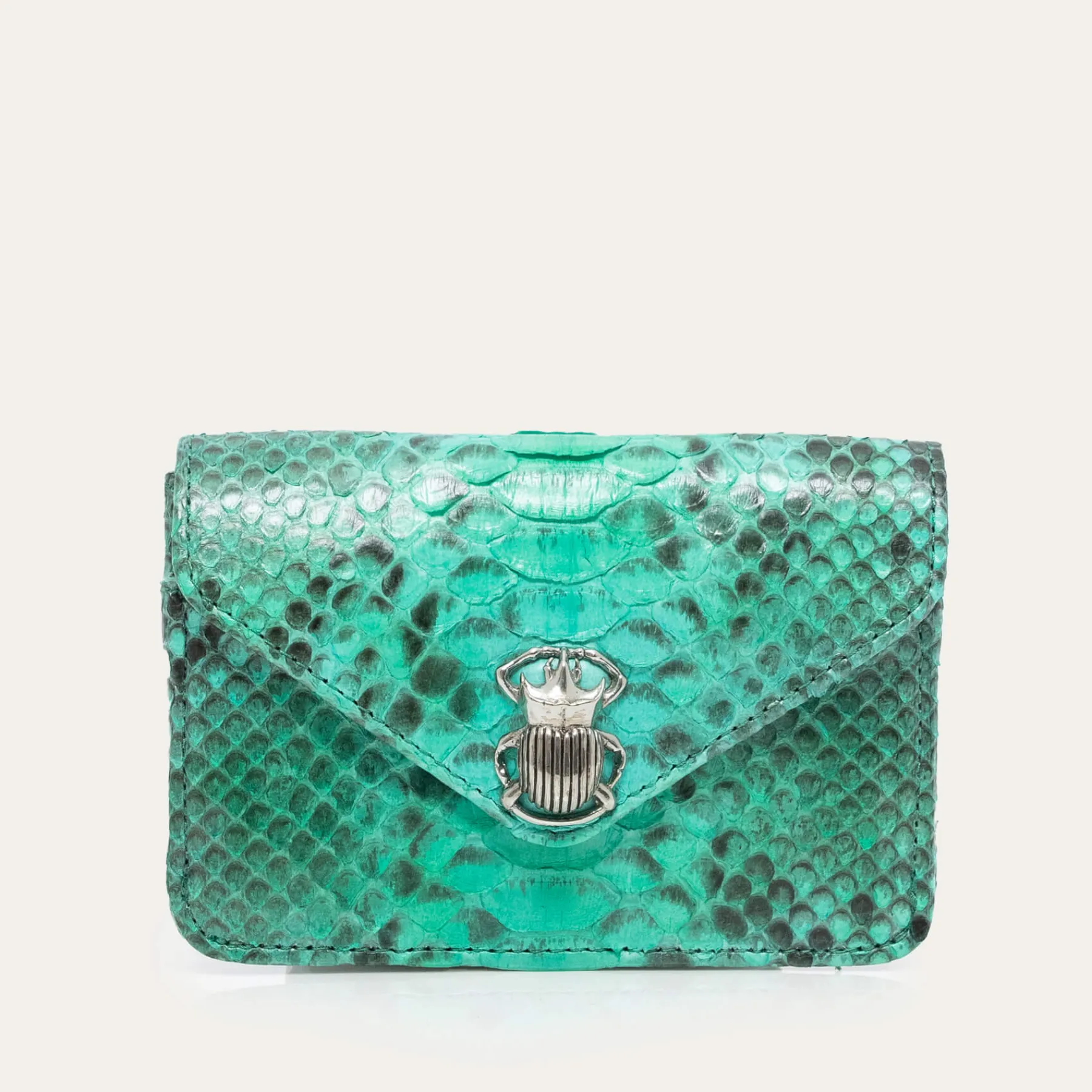 Cette petite pochette en python qui prend la forme d’une enveloppe est ornée d’un fermoir en forme de scarabée en lait…