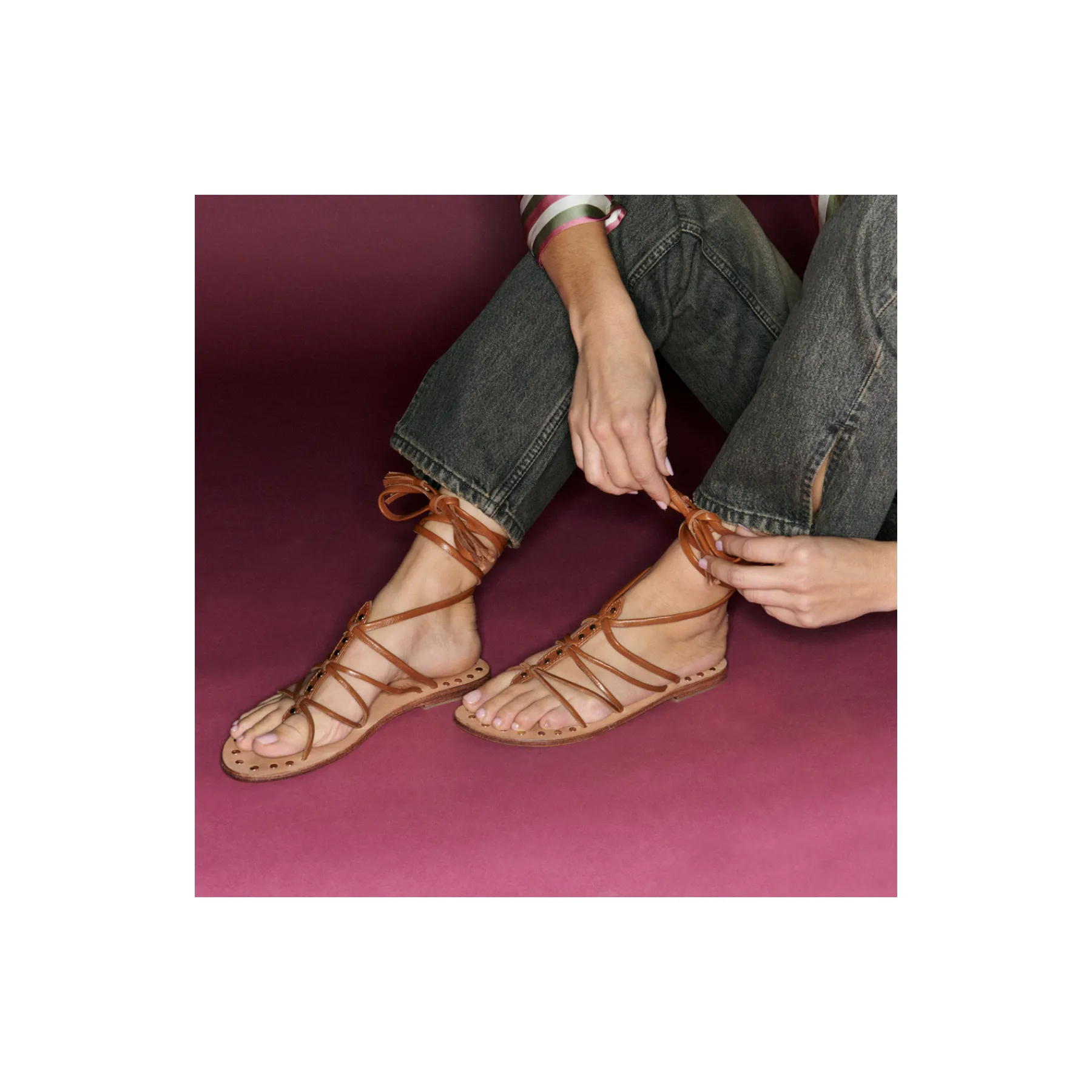 Nos spartiates en python à lanières Marine sont ornées de petits clous dorés et argentés à l’avant de la chaussure ainsi que sur les contours de la semelle. Les lanières se fixent autour de la cheville par nouage. À la fois discrète et élégante cette paire de sandale se mariera aussi bien à une tenue casual qu’habillée.