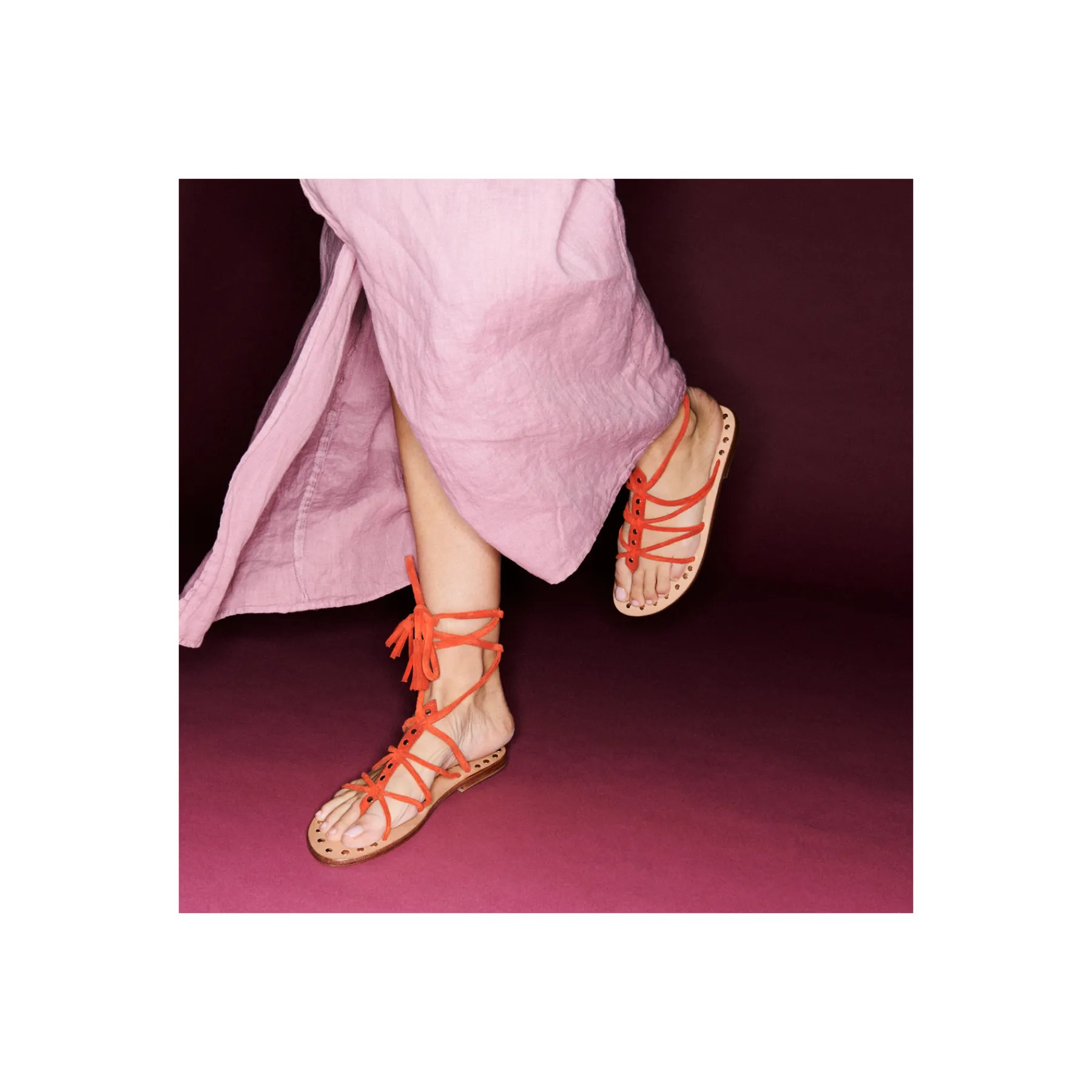 Nos spartiates en veau velours à lanières sont ornées de petits clous dorés et argentés à l’avant de la chaussure …