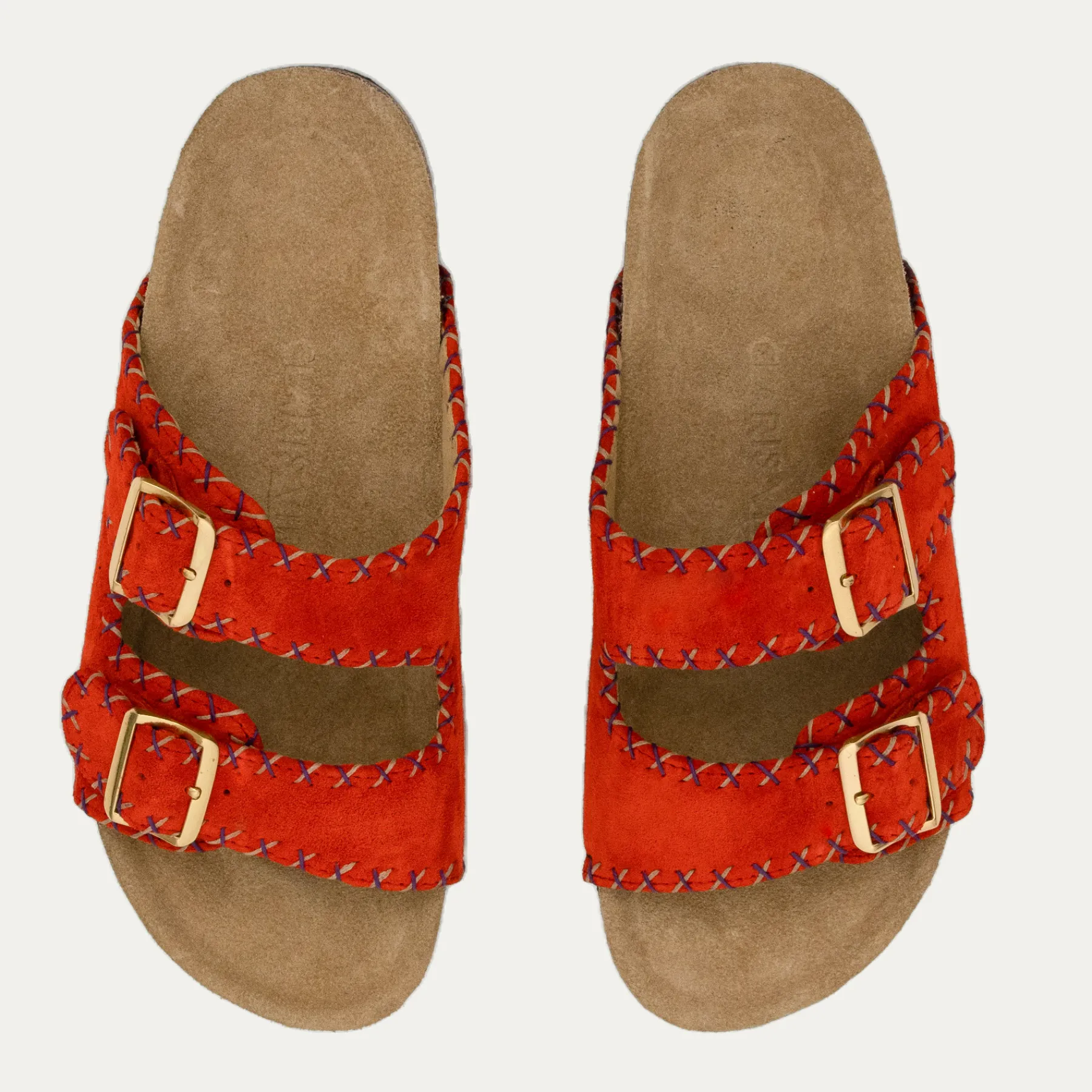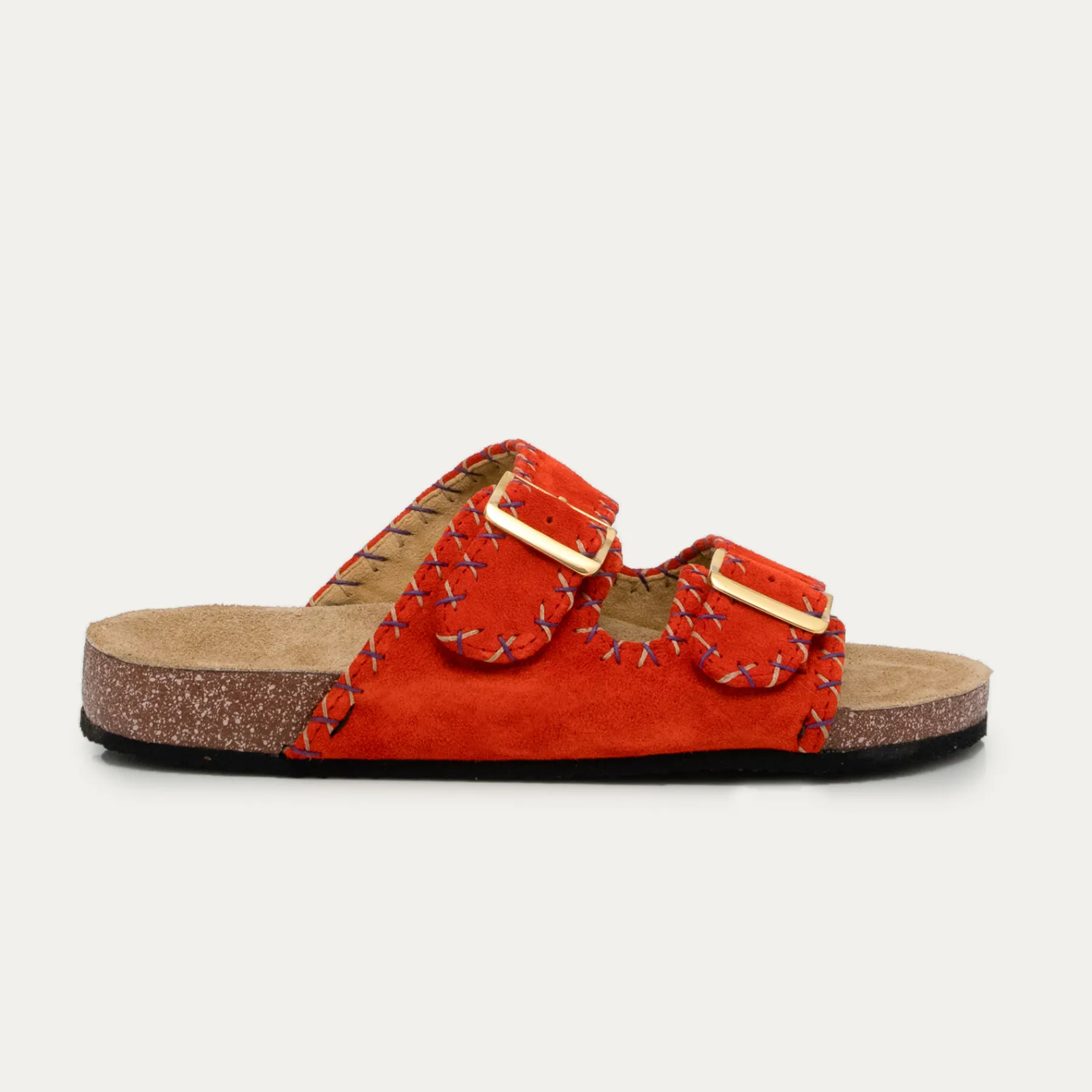 Nos sandales ajustables en Veau Velours Goyave sont doublées cuir et ornées de deux boucles carrées en métal doré. …