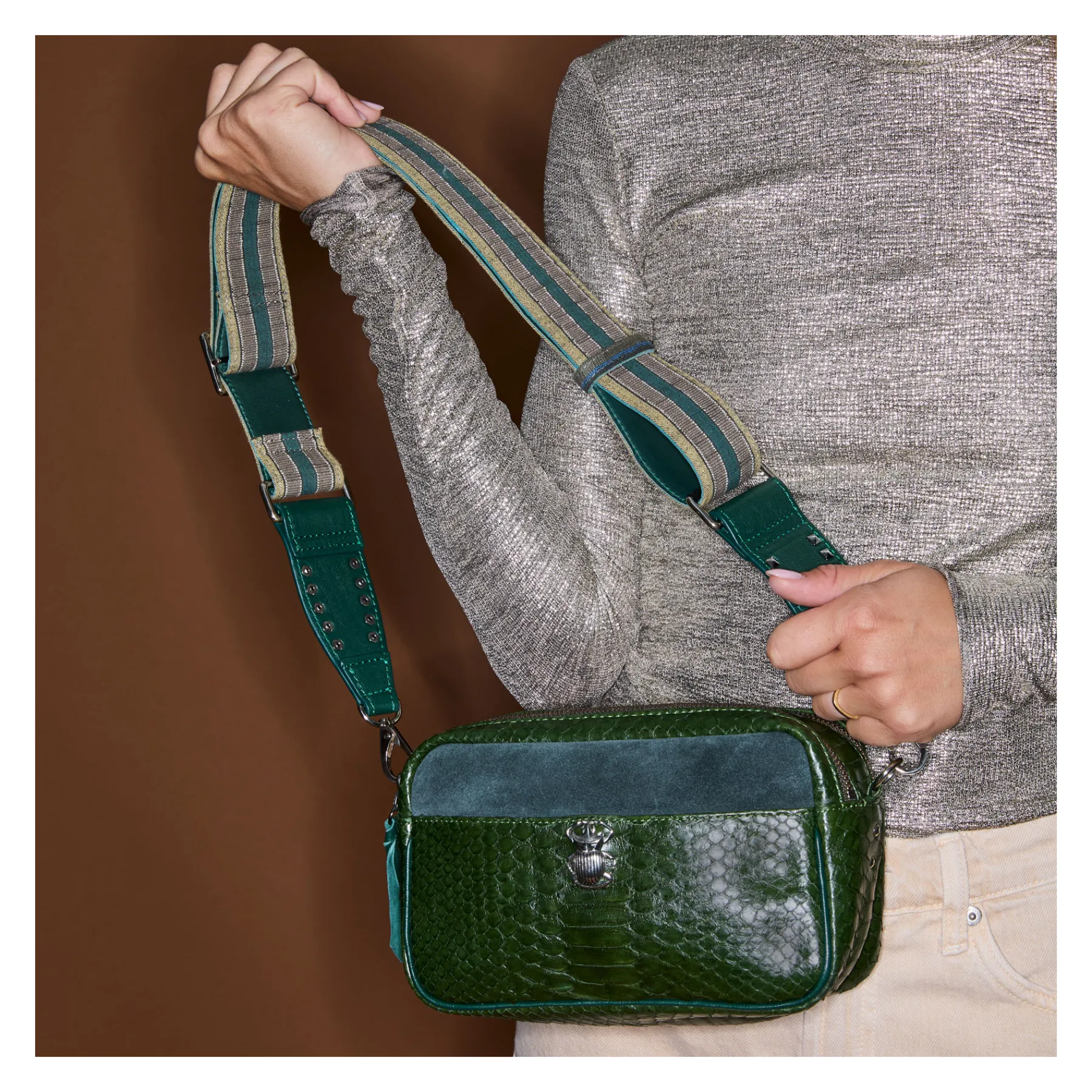Ce sac en python et agneau velours porté épaule ou croisé est organisé en deux compartiments avec une poche centrale parfaitement étudiée pour y accueillir votre téléphone. Ses deux compartiments distincts ont été pensés afin de vous organiser au mieux! Enfin, sa large bandoulière en tissu Timor permet un porté confortable et léger.